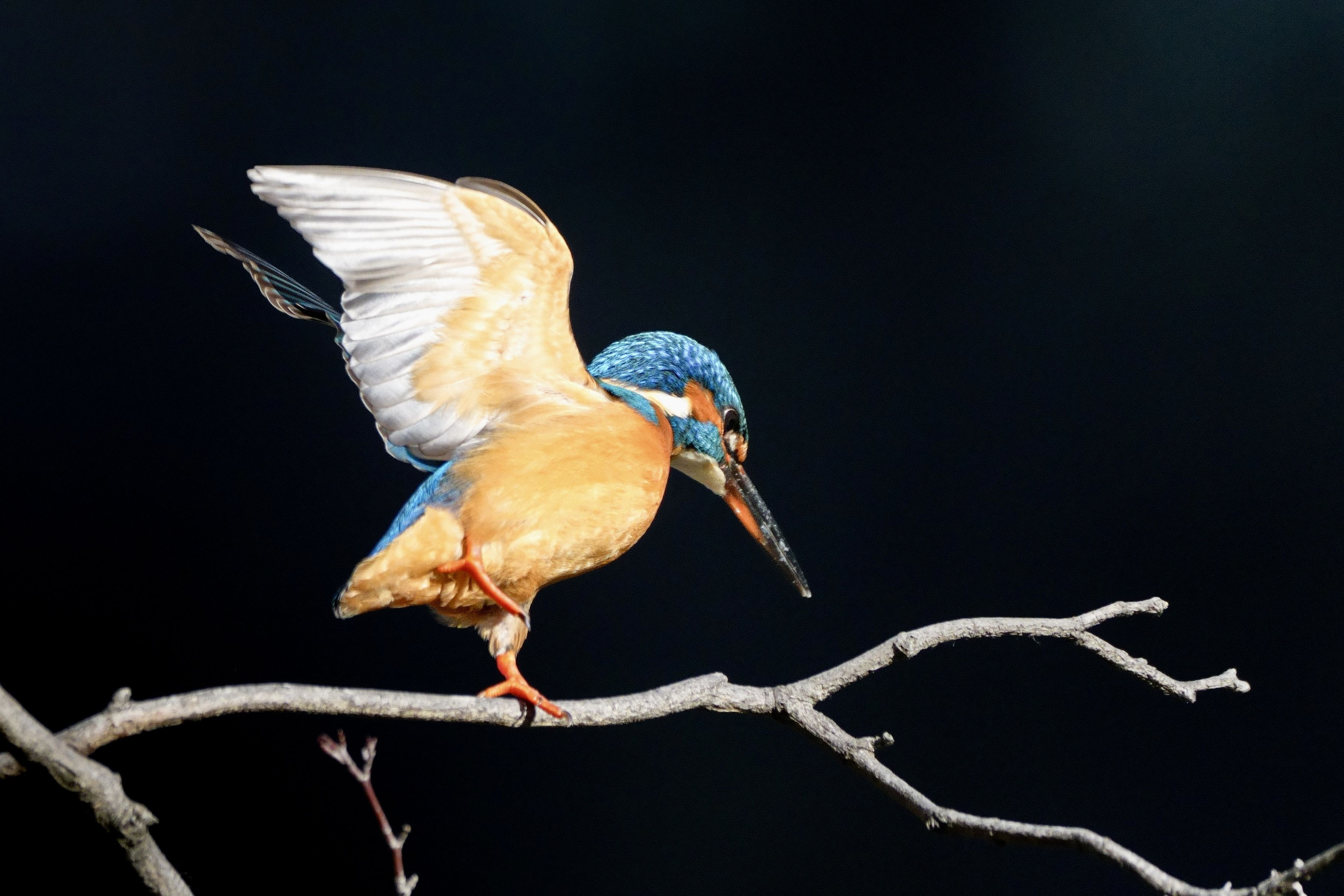 翼を広げながら体重を前へ移し、次の動作につなげている様子が印象的でした。飛び込みを開始する前の一瞬です。