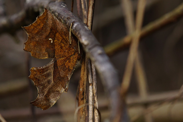 雲が日差しを急速に遮った撮影日。キタテハの秋型♀が早々に宿入りしていました。宿は積み置かれた梅の剪定枝です。