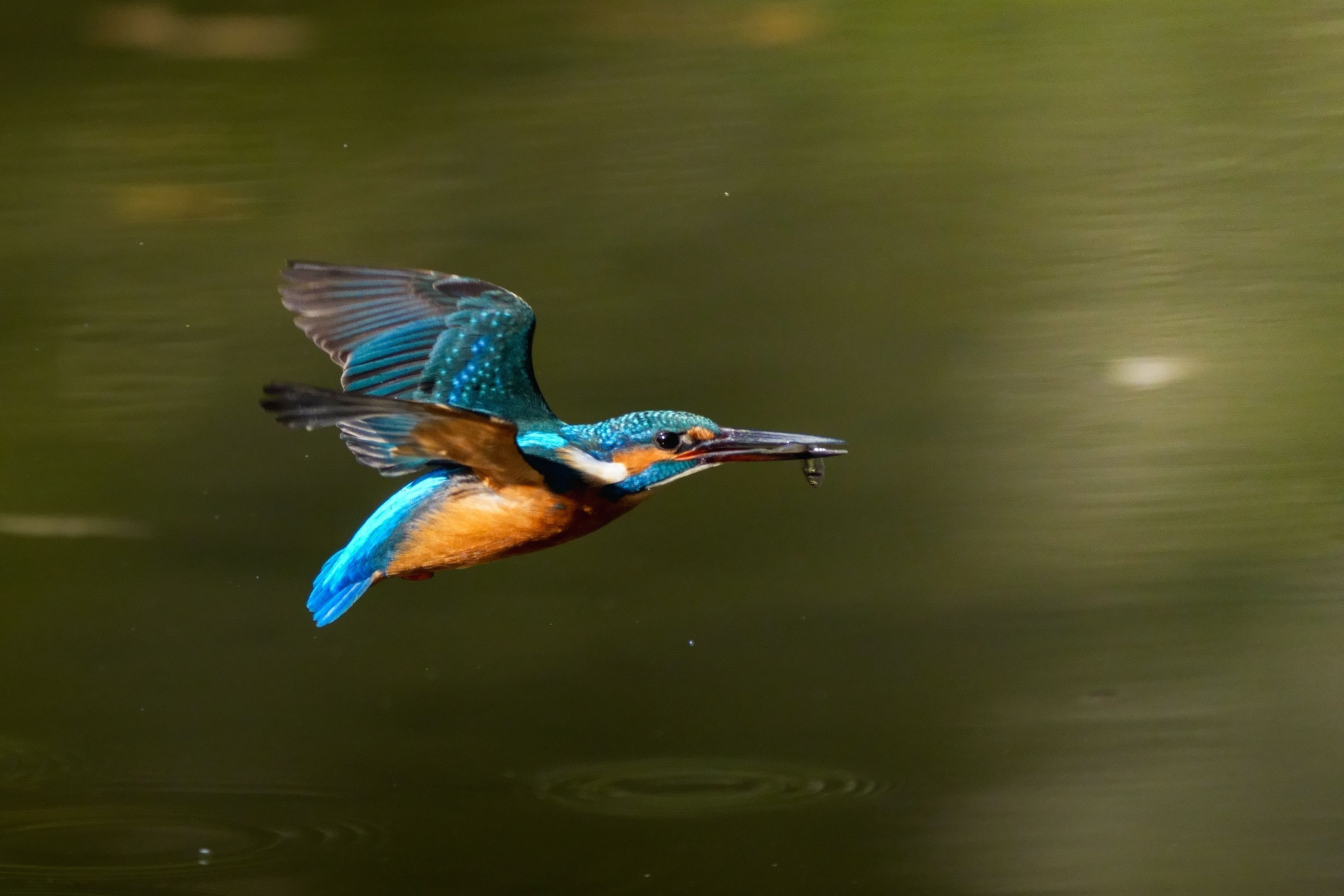 水面から浮上して体勢を整えた後、力強く前進する姿を捉えました。