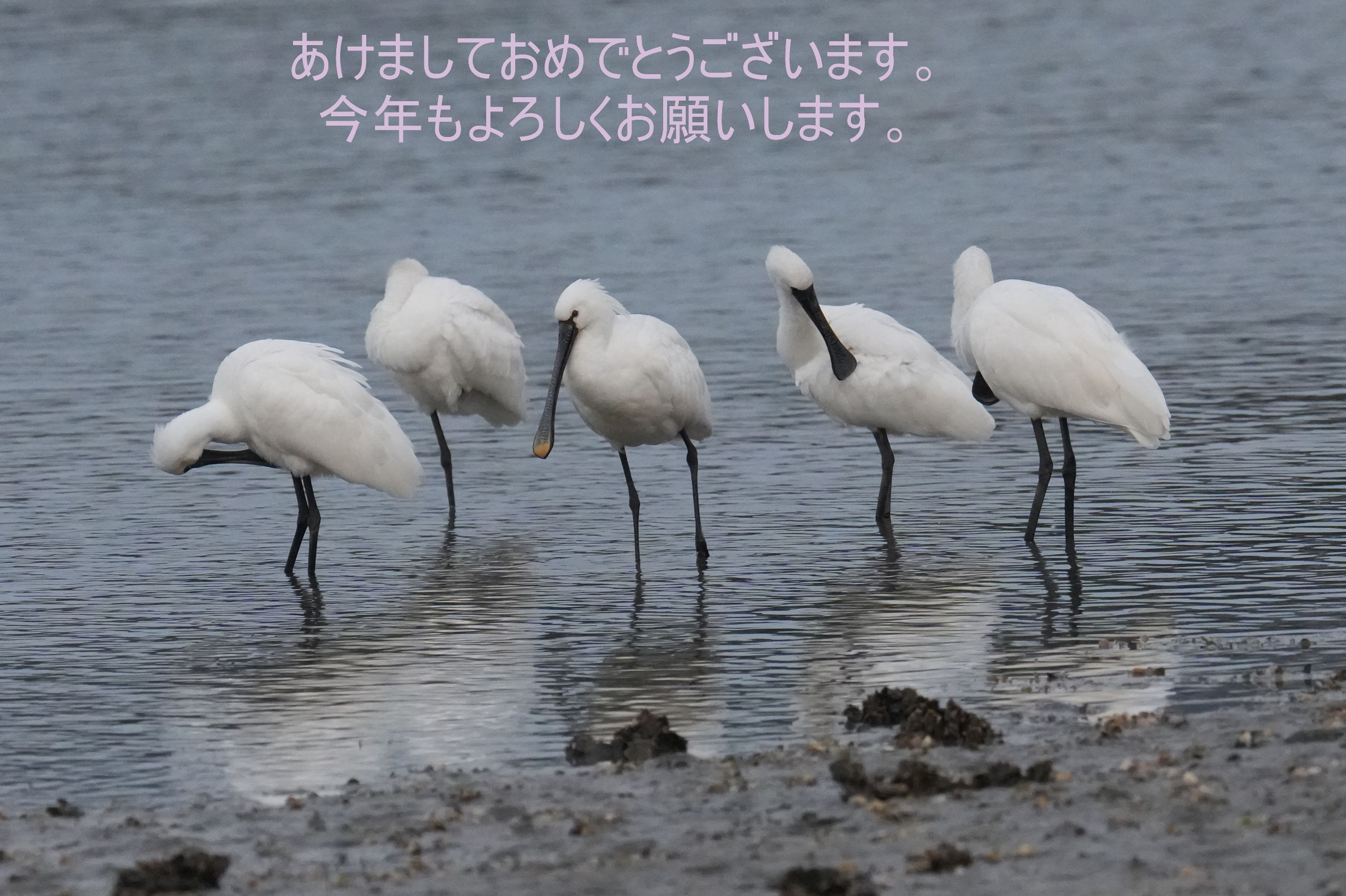 元気なクロツラ一家です。今年もよろしくお願いします。 あ、真ん中はヘラサギちゃんですね。一緒に仲良くやってます。 #クロツラヘラサギ#&#ヘラサギ#