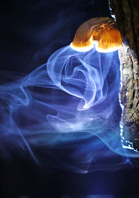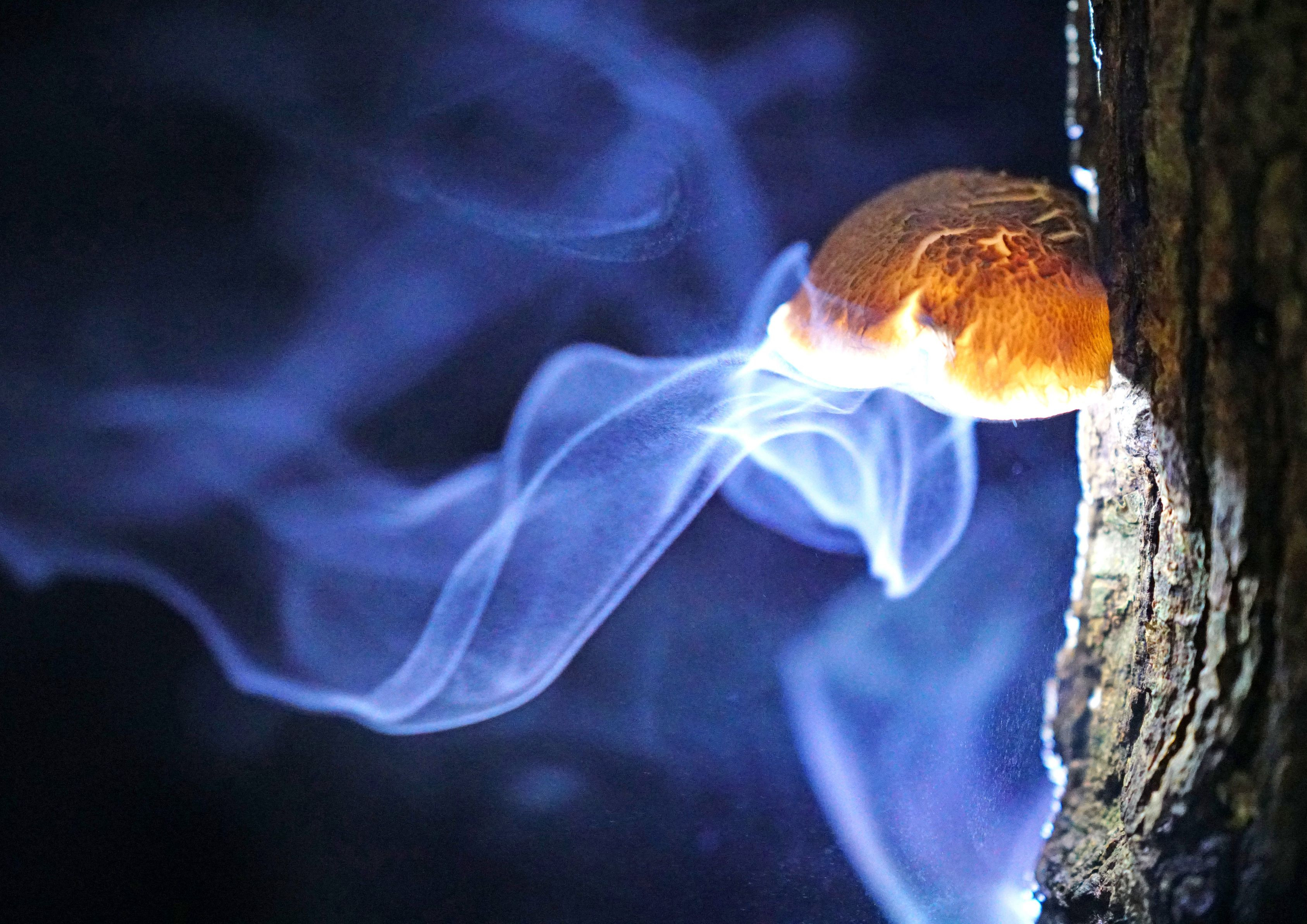 原木椎茸の胞子の放出する姿は、羽衣が舞うがごとく美しい。
