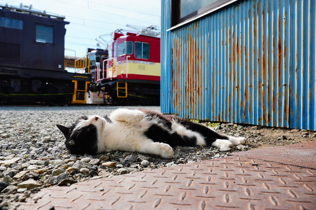 今日は保線作業だったのかな? 線路を歩いて帰ってきたオセロ君。 疲れたのか、戻ってきてどてっと横になりました(笑)