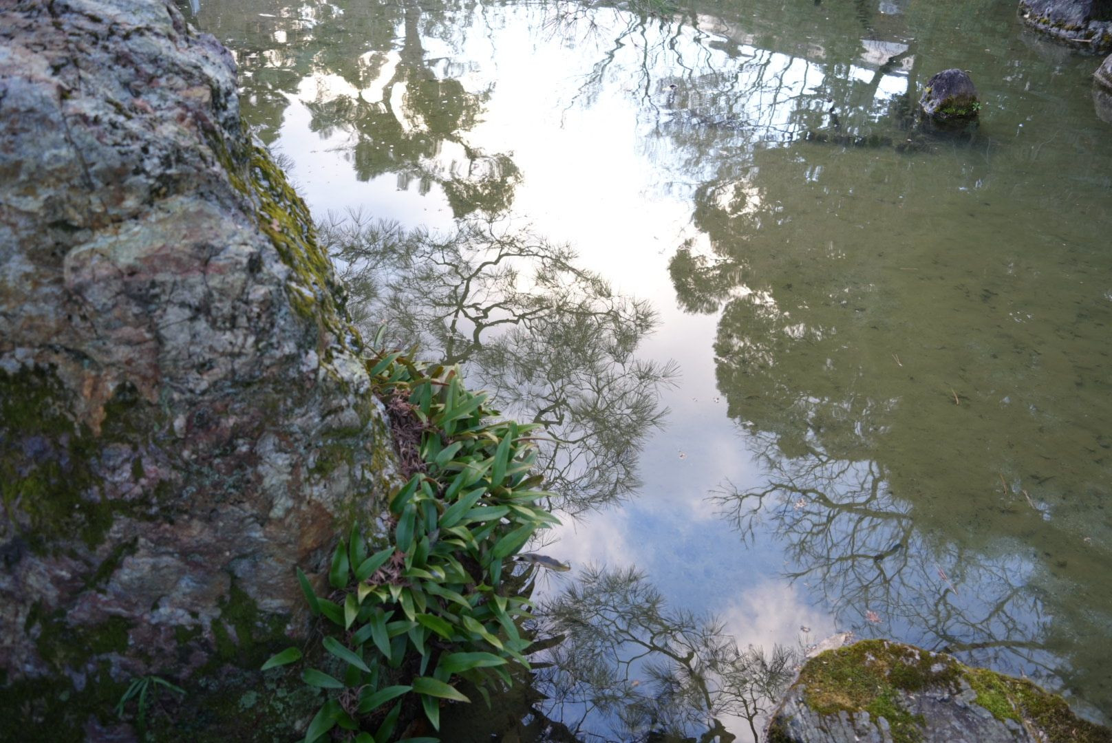 初詣の後に神社の庭園にて撮影しました。 池の水面に青空が映っています。寒い冬の一日でした。