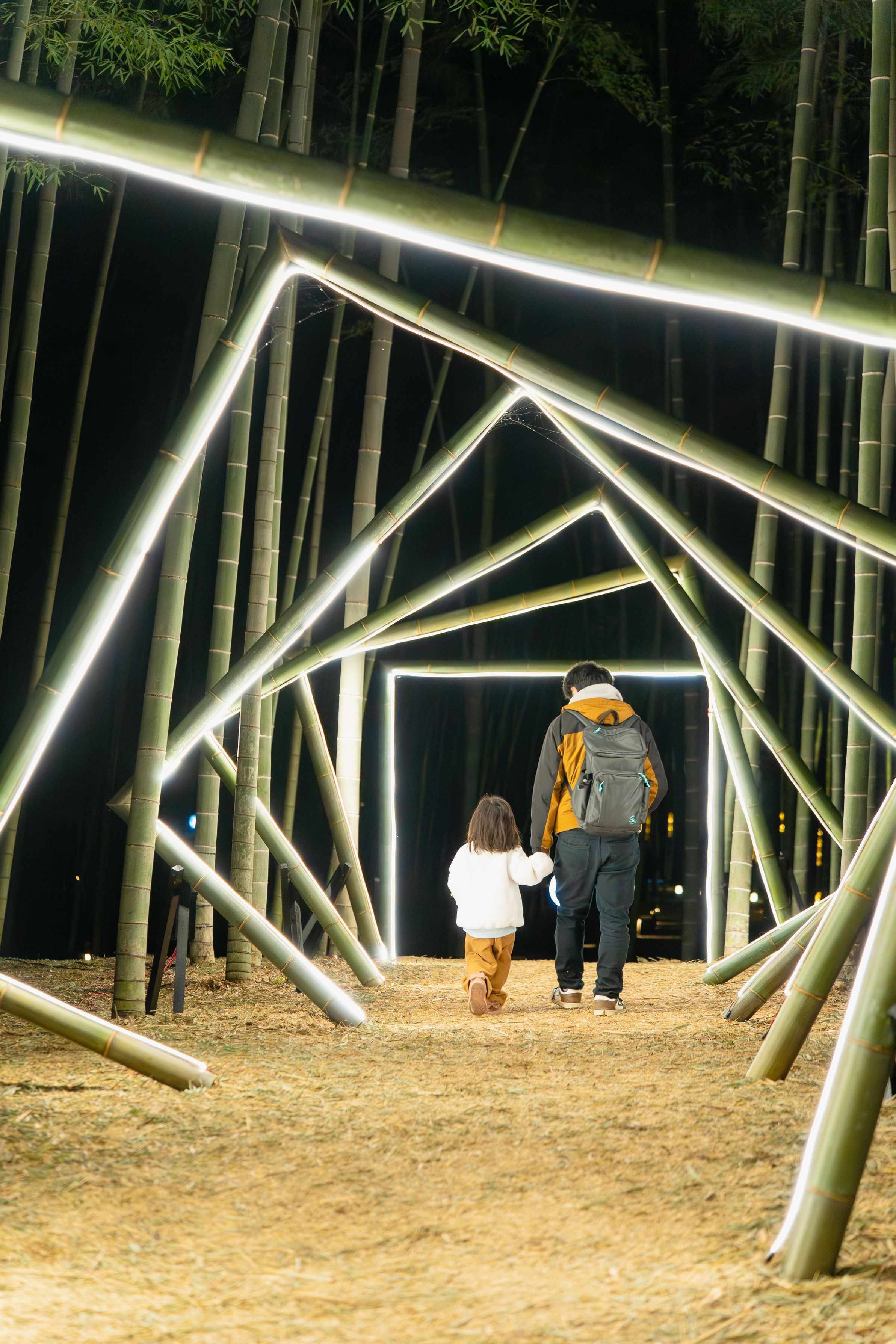この先に大きな竹ブランコがあるのですが、娘はそこに早く行きたくてパパの手を引いて歩いている姿です。
