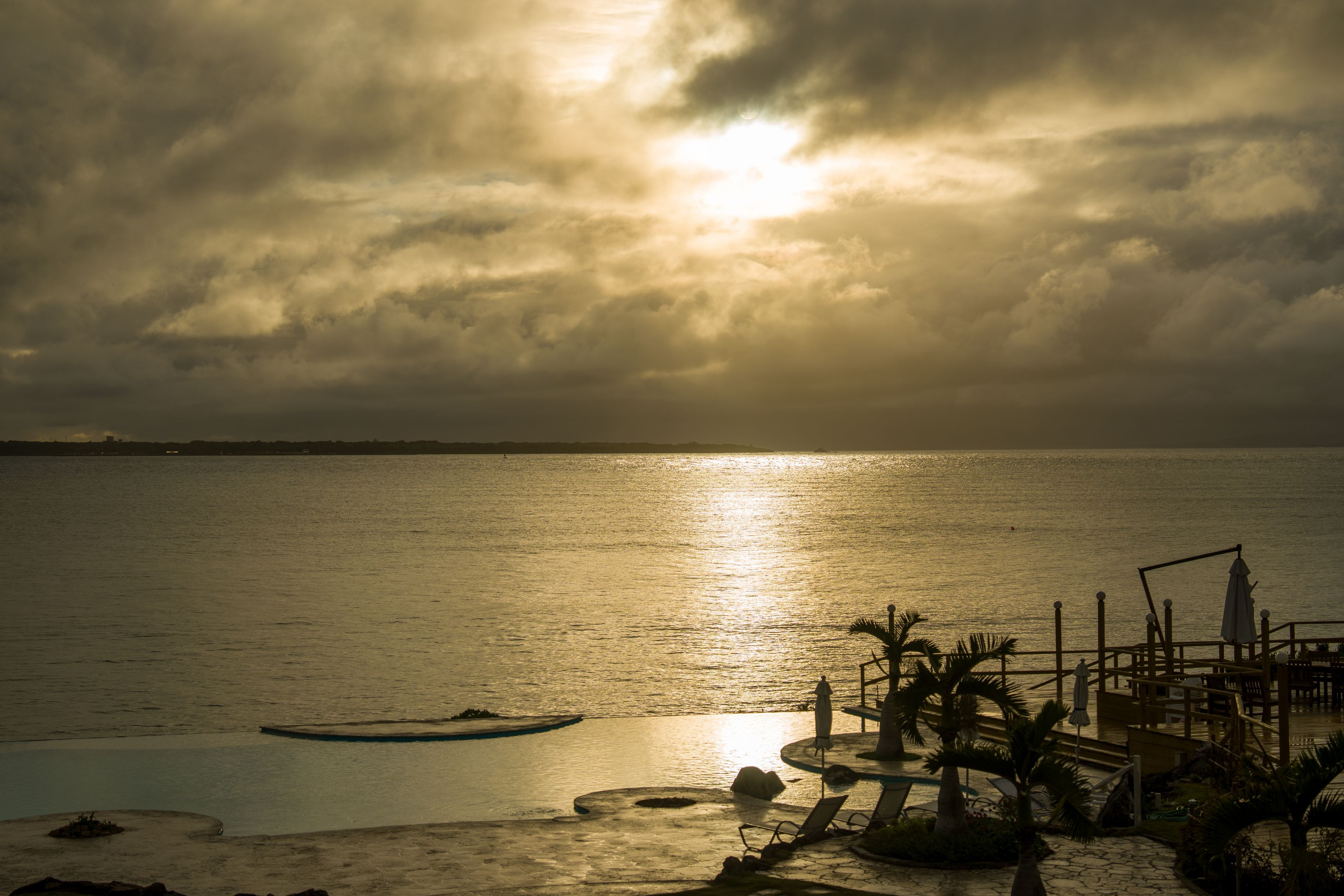 石垣島ビーチホテルのサンセット 前に見えている島は竹富島 雨の日に夕暮れに一瞬日が出て光の道が現れました。
