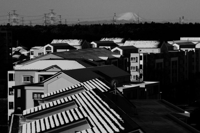 新年の我が家からの雪景色ですが日常の見慣れた景色に雪が被り、何となく新鮮な気分になってモノクロで表してみました。