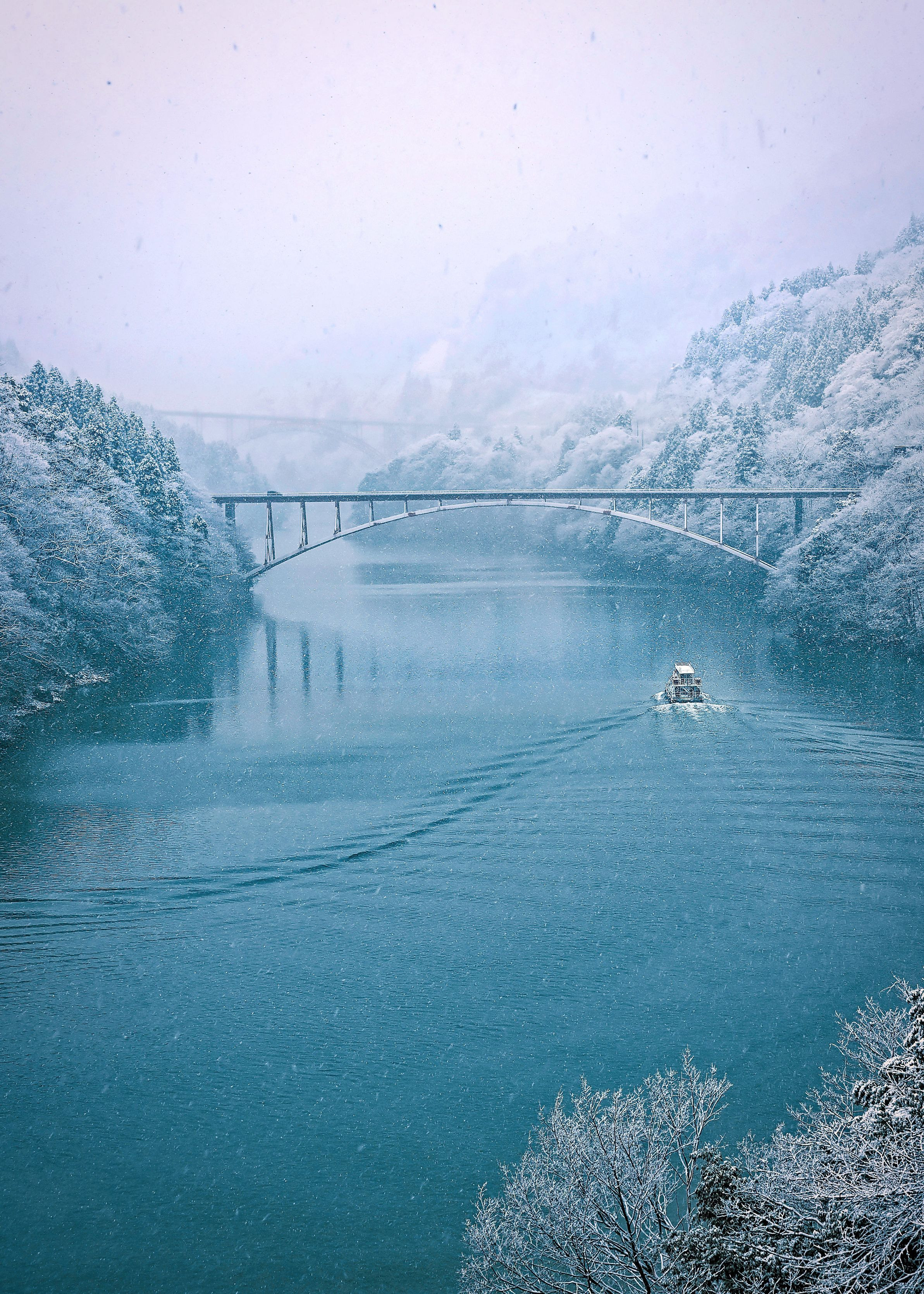 雪が積もったばかりの庄川峡を遊覧船がゆっくりと進んでいきました。