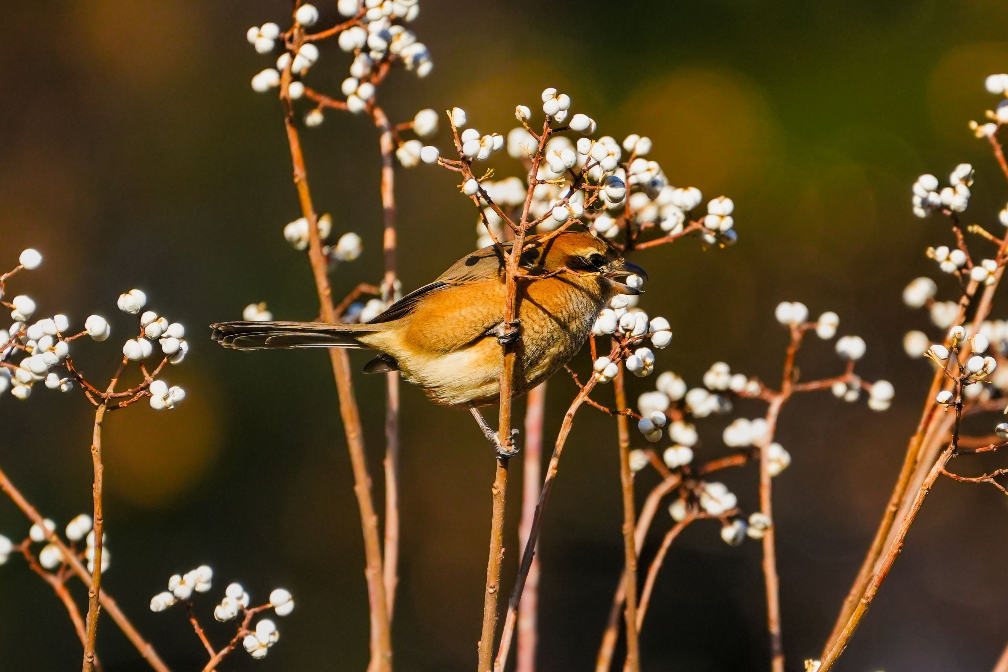 白い木の実を食べるモズ君