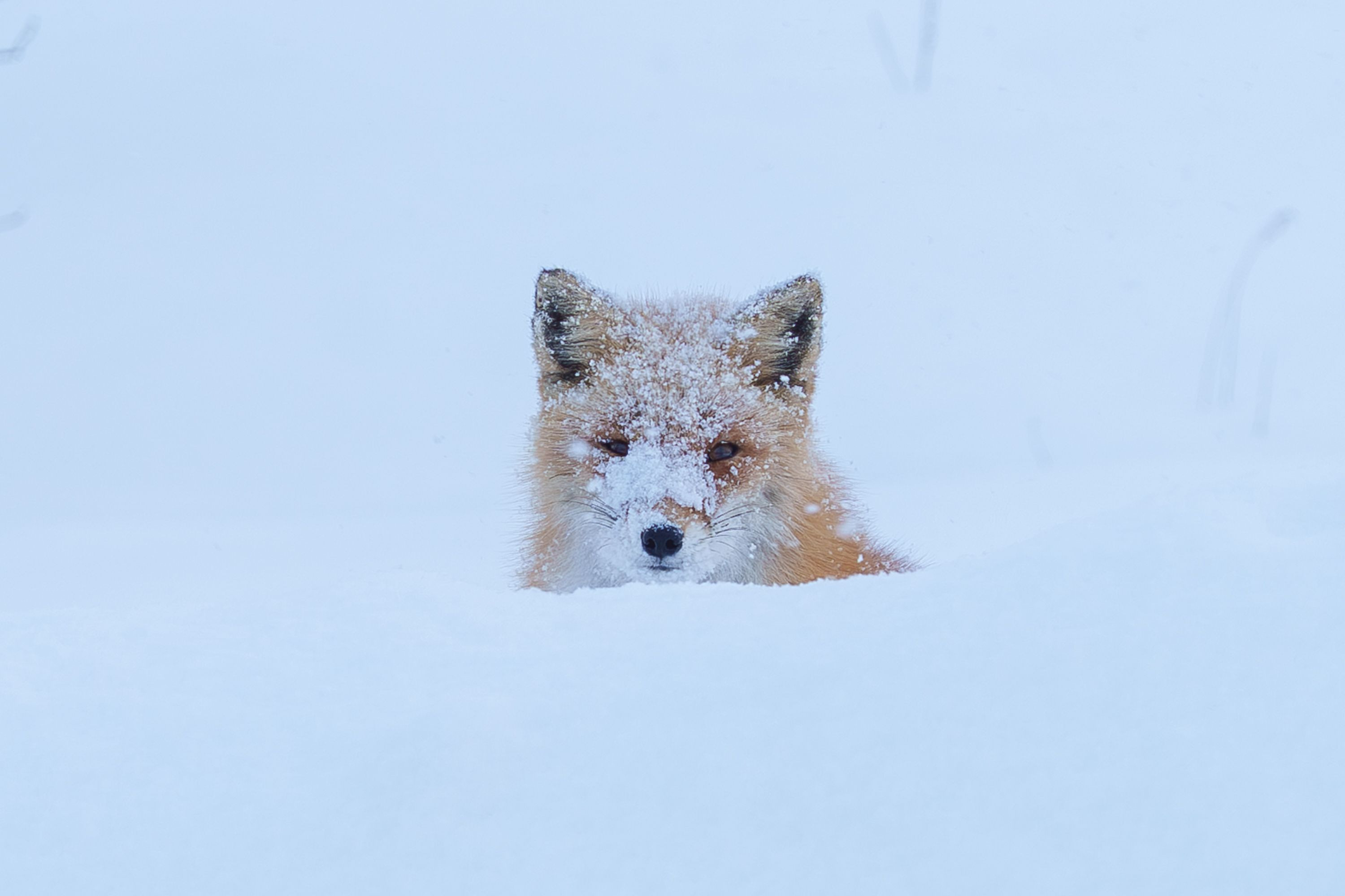 顔じゅう雪まみれのキタキツネさんと出逢いました。こちらを見つめるその顔には、たくさんの雪がついていて、もしかしたら狩りをしていたせいなのかもしれません。