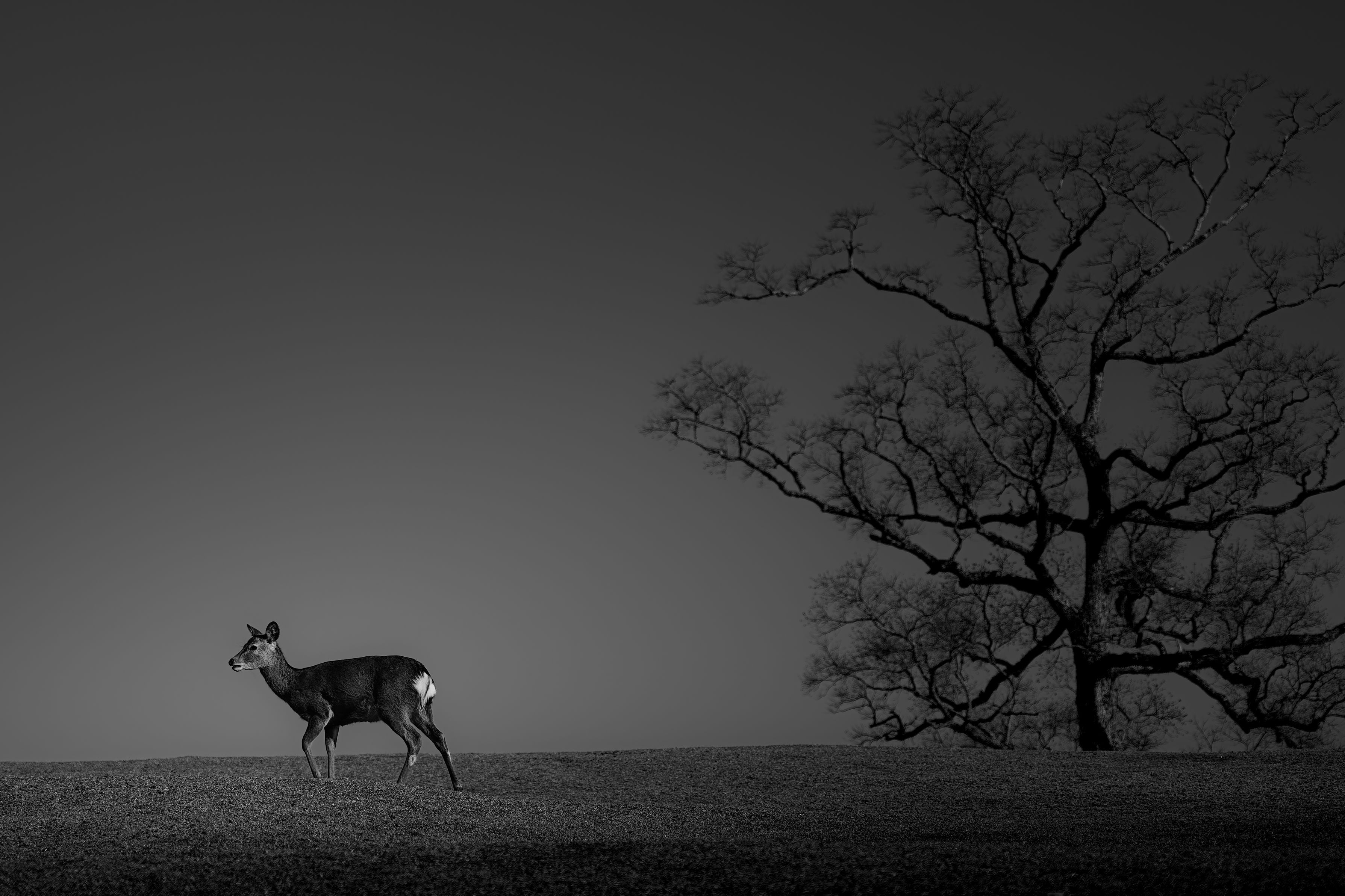 繊細な枝を広げる古木と、その傍らをゆく鹿。 広大な空を背景にした絶妙な距離感を、モノクロームでグラフィカルに表現しました。 緻密な描写と深い黒のコントラストが、奈良の冬の厳しさと美しさを引き立てます。(^^