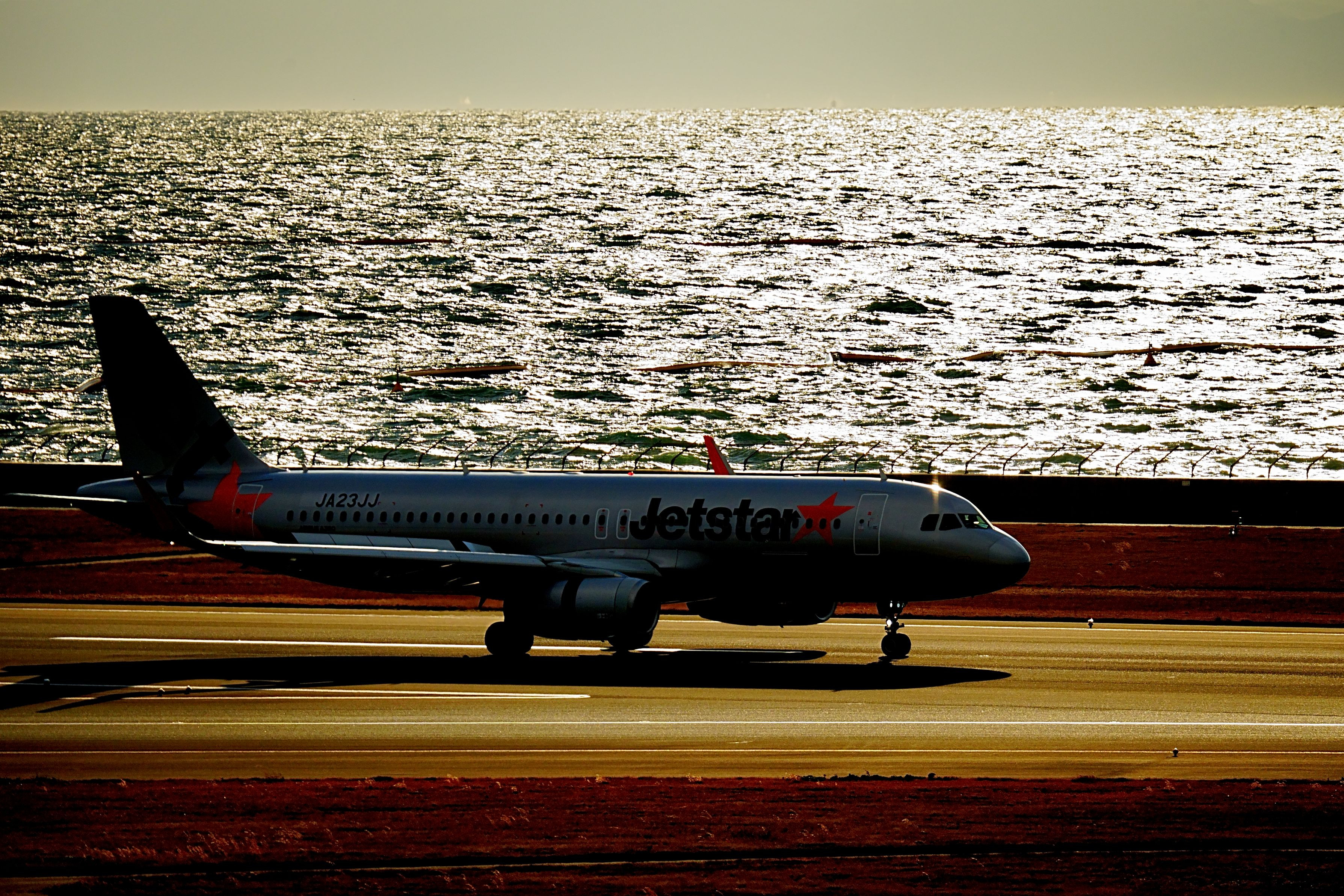 少し傾きかけた太陽の光を浴びたキラキラの海をバックに着陸したJETSTAR☆です。