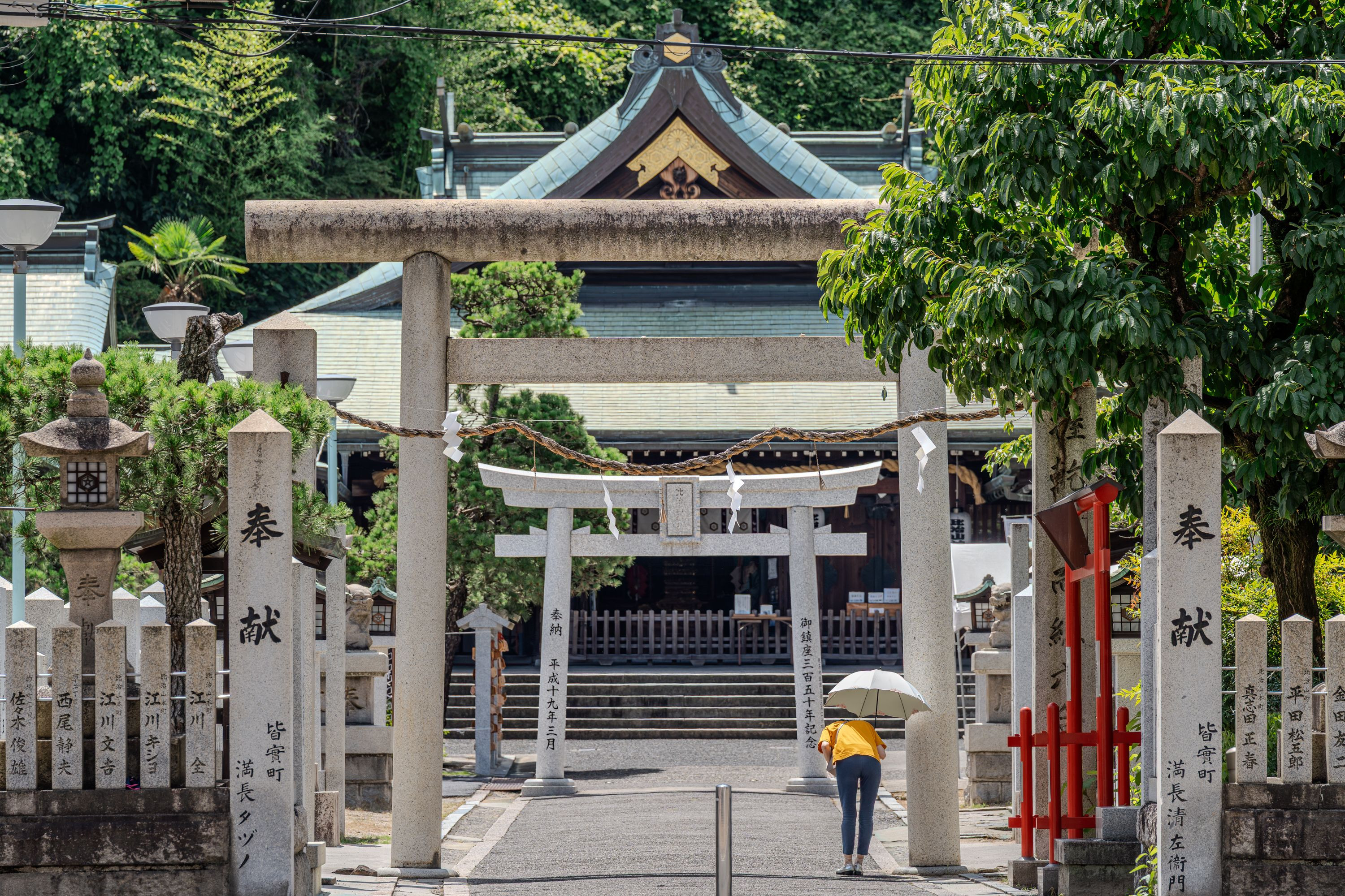 猛暑の中、広電の路面電車を撮りながら街を散策した。比治山神社まで足を延ばしたら、外の鳥居と中の鳥居が重なるアングルを見つけた。しかも日傘をさした参拝者が頭を下げようとしていた。すぐさまカメラを構えて撮った。