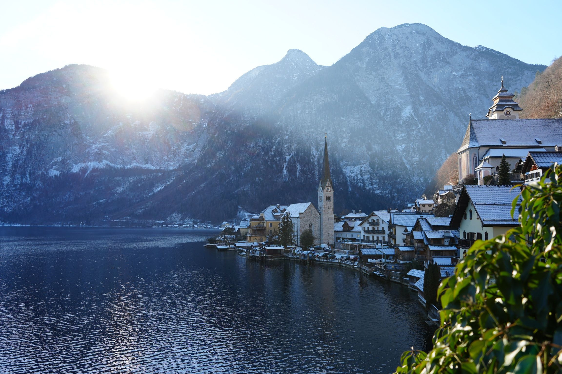 冬のハルシュタット 写真は現地時間で11時ぐらい。 この時間にようやく街に陽が差し込みます。 が、 太陽は写真の位置からほぼ水平に右側へ移動するため、1時間後にはすぐ右にある山に隠れちゃいます。 冬の街への日射時間は1時間・・・・😅