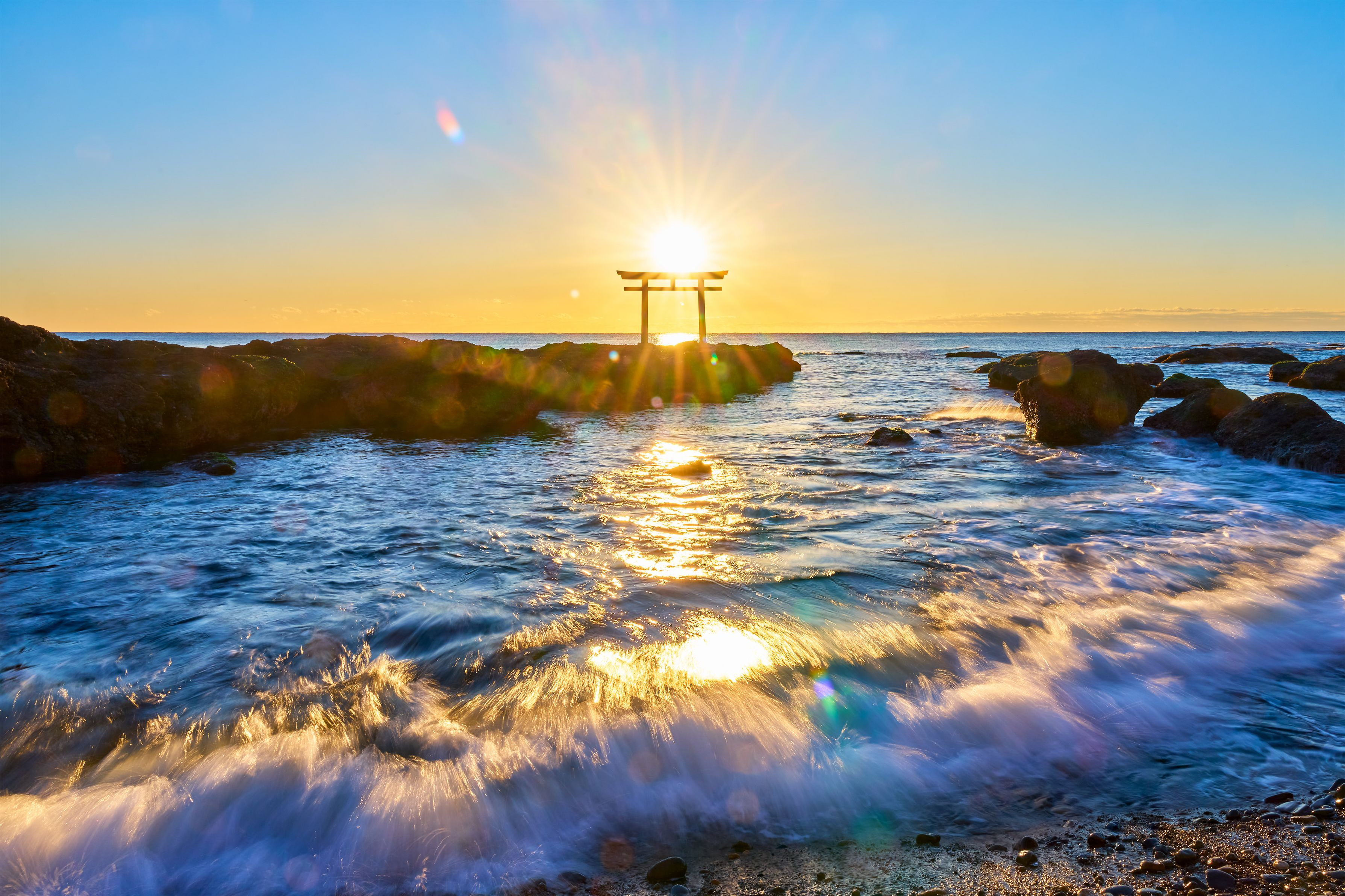 大洗磯前神社(おおあらい いそさき じんじゃ)の鳥居と朝日です(茨城県大洗町)。2019年にもほぼ同じ構図で撮ったものがあるのですが、新しいカメラとレンズで、ということで。買ったばかりの medium GND フィルターを撮影中に運悪く落として割ってしまい、NDフィルターだけを使っています orz
