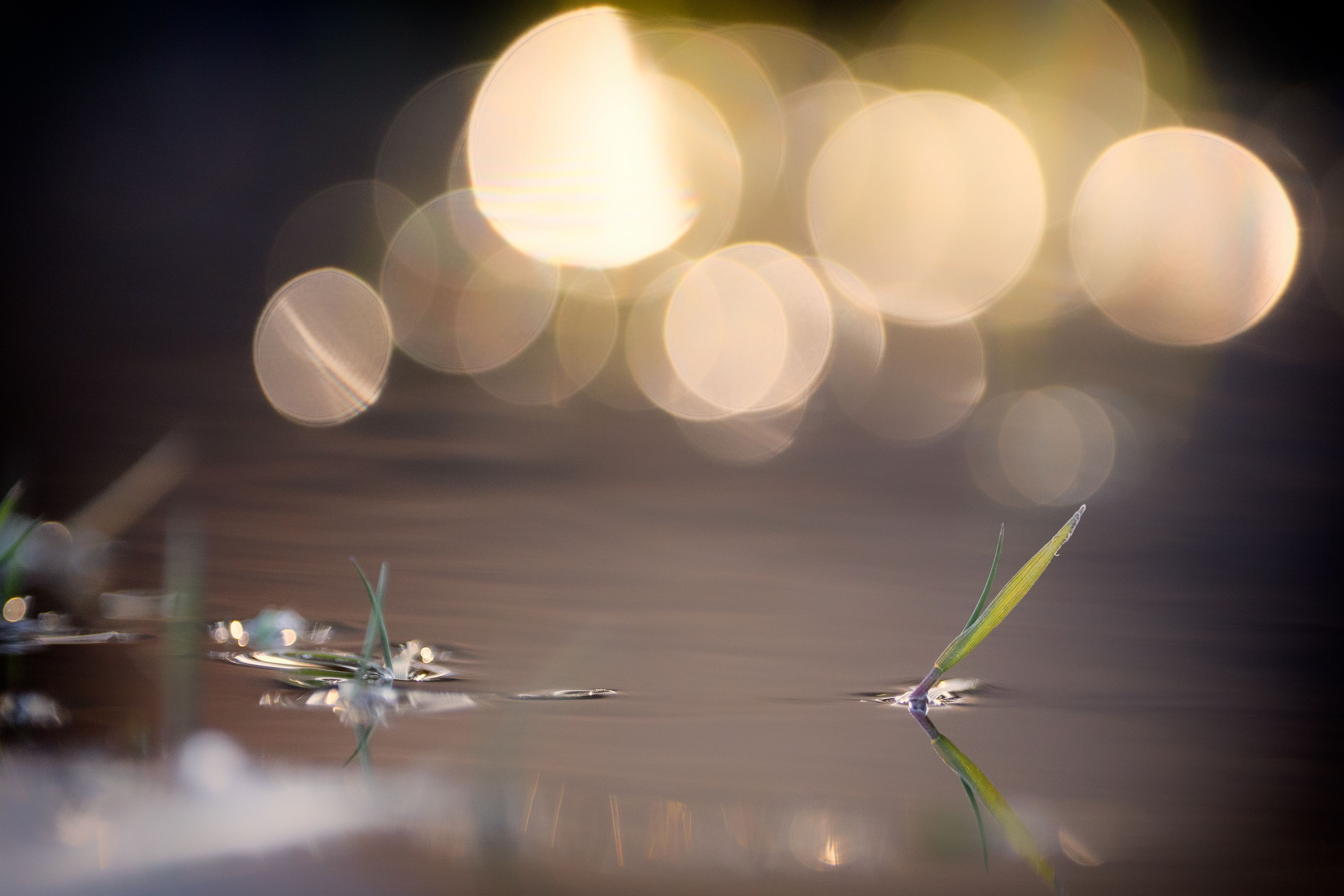 身近にある小川に生えている水草を水面の玉ボケをバックに撮りました。