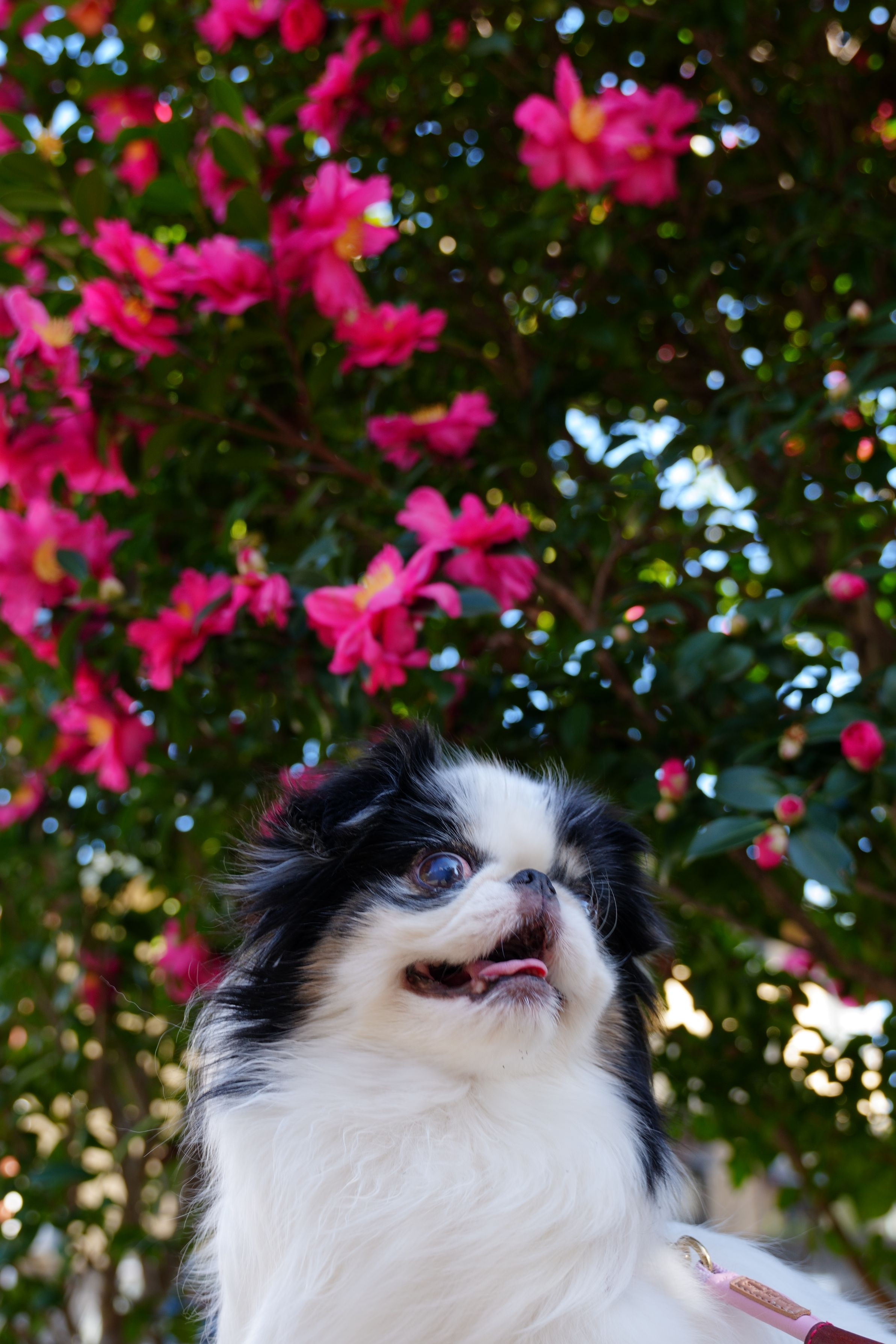 山茶花と愛犬を梅光園緑道で撮影した