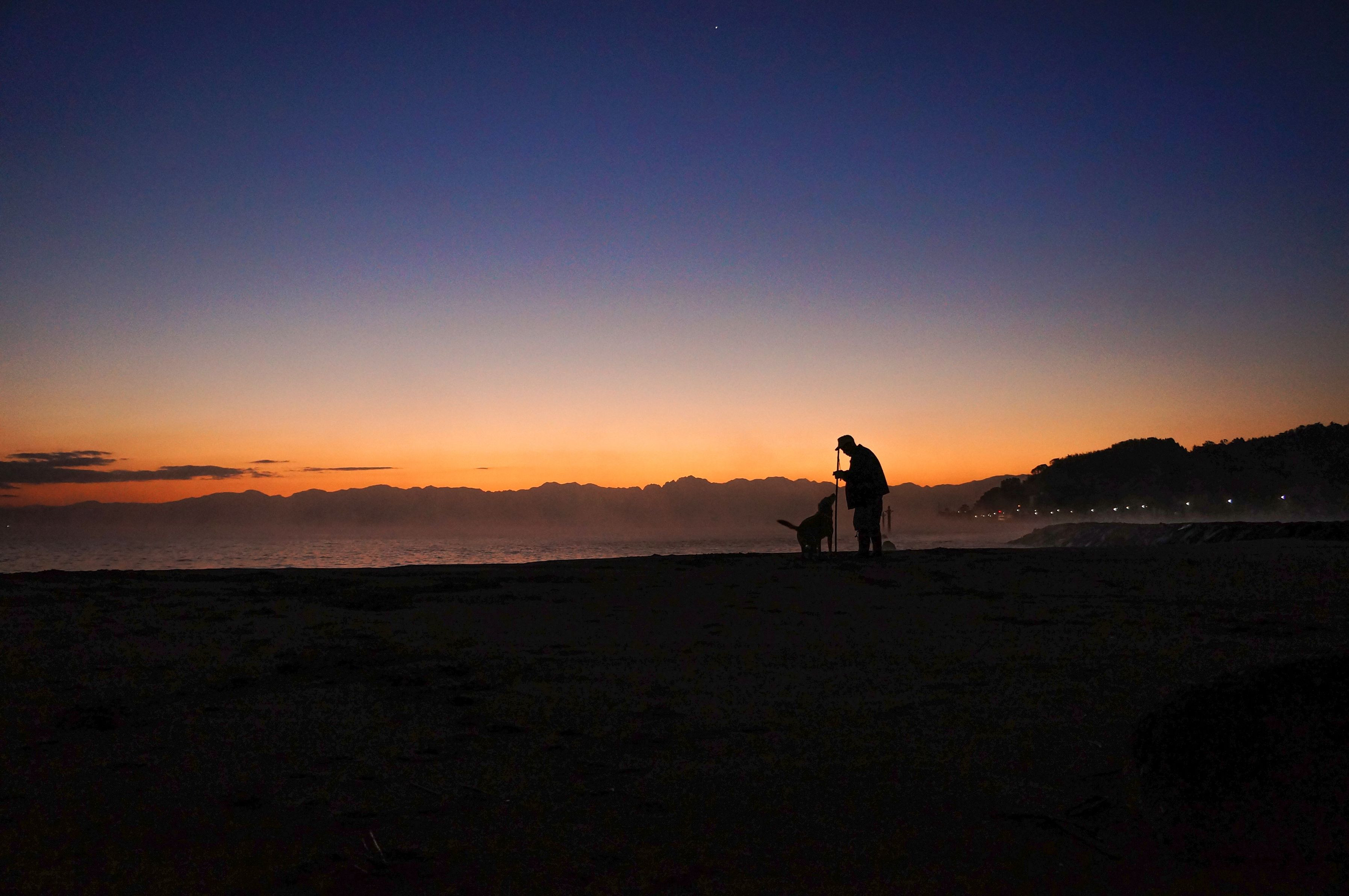 冬の朝の浜辺に立ち寄ってみるとそこには近所のおじいちゃんとワンちゃんが。まるで映画のワンシーンの様な瞬間に立ち会うことができました。氷点下まで下がったその日、普段は布団の中から出たくない!が強く、なかなか行動できなかった自分が綺麗な写真を撮りたいと早起きして見た結果出会えた一枚。早起きして見るのもいい写真を撮るコツなのかもしれません。
