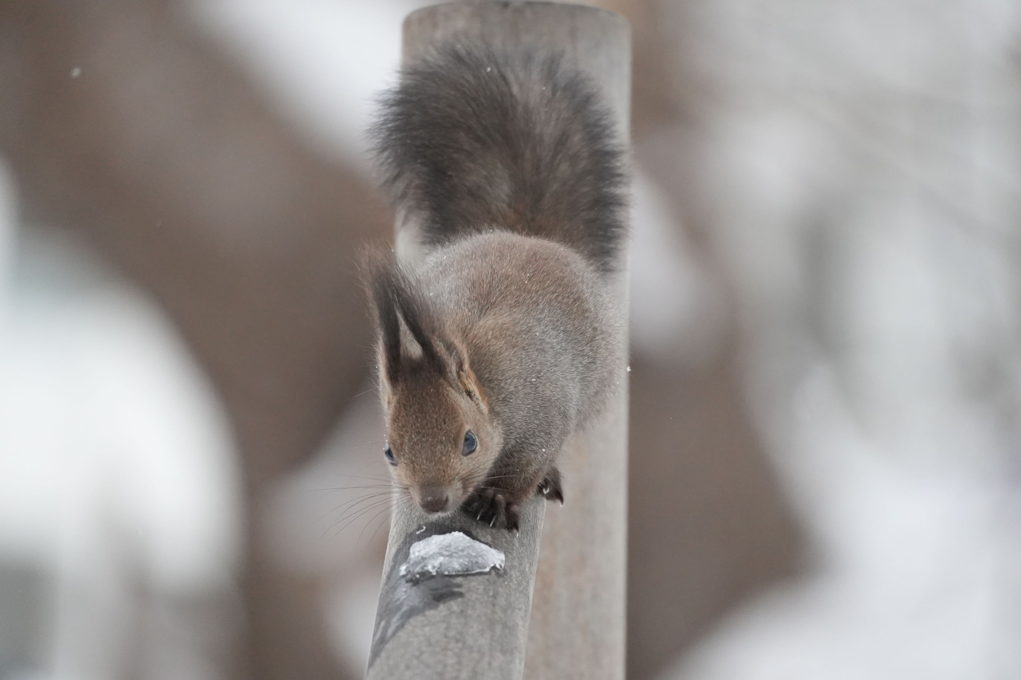 人間の手すりは、エゾリスにとっては道になる様です。雪に見えても下が氷になってて滑るかもしれないので、ご注意を。 街なかの公園に住むリスだからか、近づいても逃げる様子ゼロでした。もう少し警戒心持っても良いんだよ。