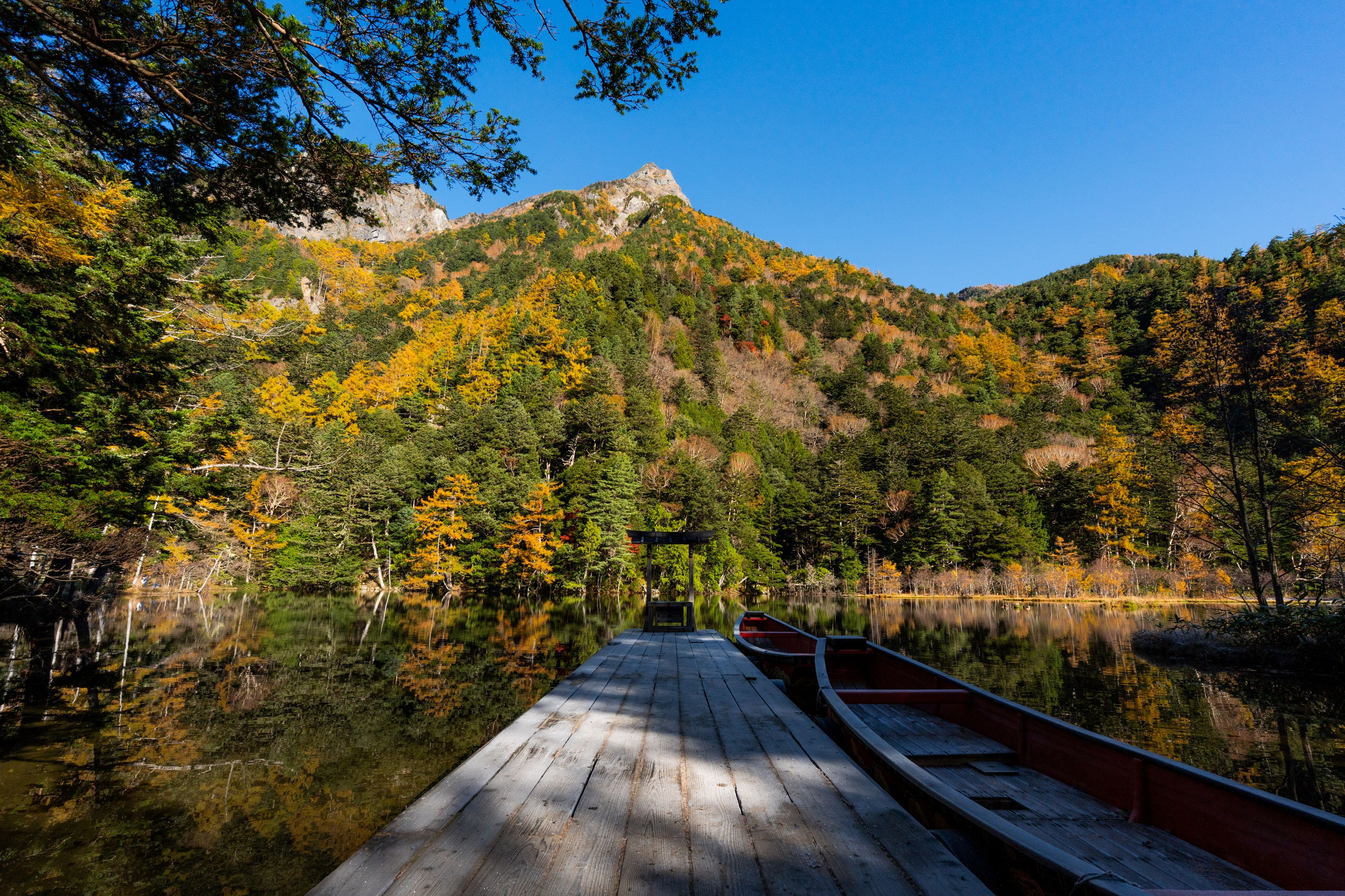 上高地二日目、まだ日の光が低い時間帯に明神池を訪れました。 鮮やかな紅葉を鏡のように映す水面に驚きました。 自然豊かな上高地の中でも一際清らかな雰囲気を感じました。
