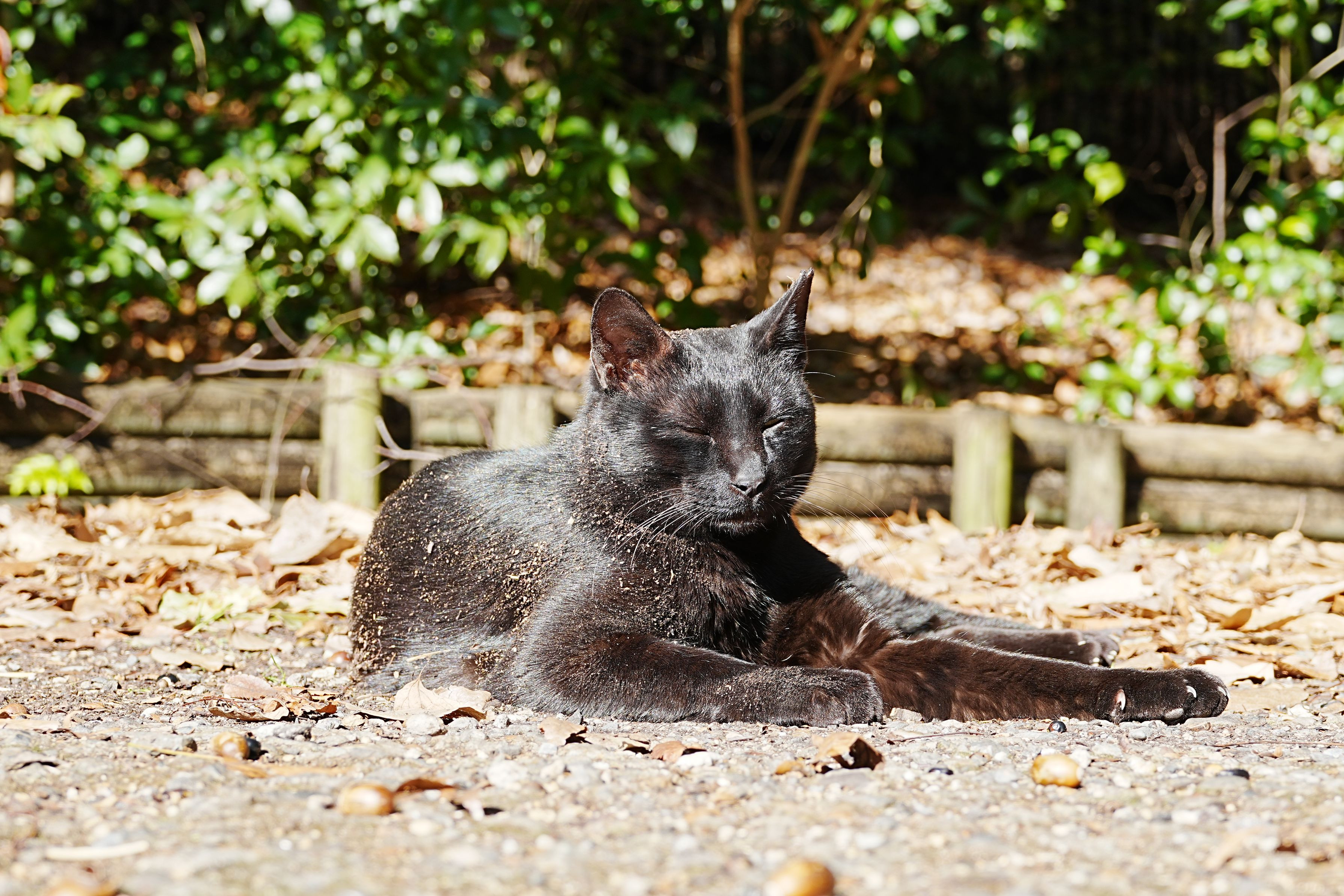 地面でゴロゴロして落葉くずなどがついてしまった公園猫