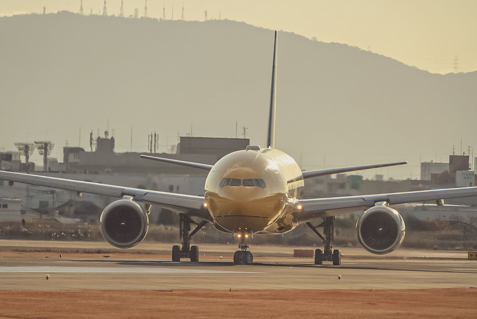 元旦の朝、那覇に向かうC-3PO ANA JETが初日の出の朝日を浴びて金色に輝く。 このカラーリングも定期運行も終了になり 貴重なワンシーンでした。 #伊丹空港#