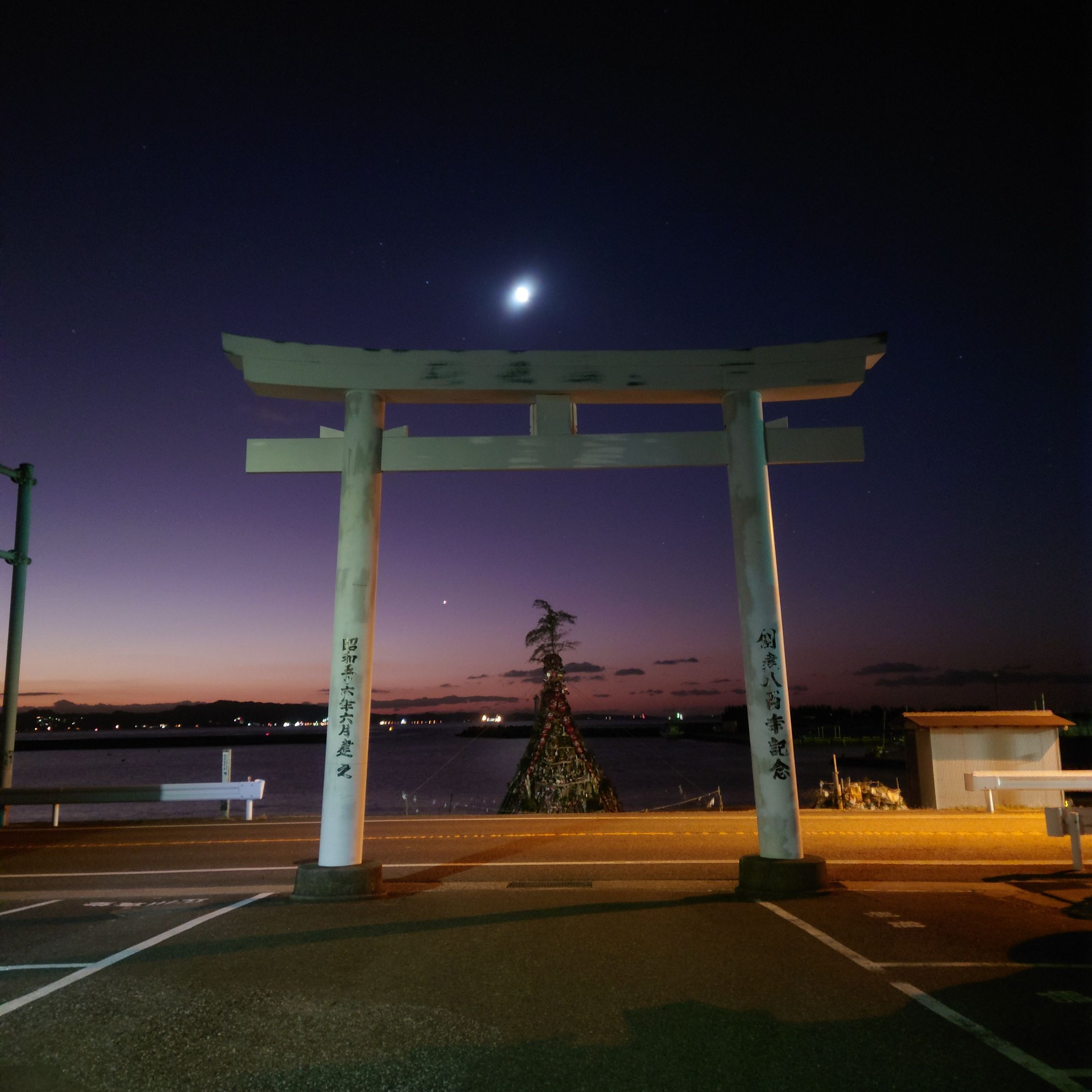 夜が開ける前 さいと焼きの為に積み重ねられた縁起飾りを眺めに