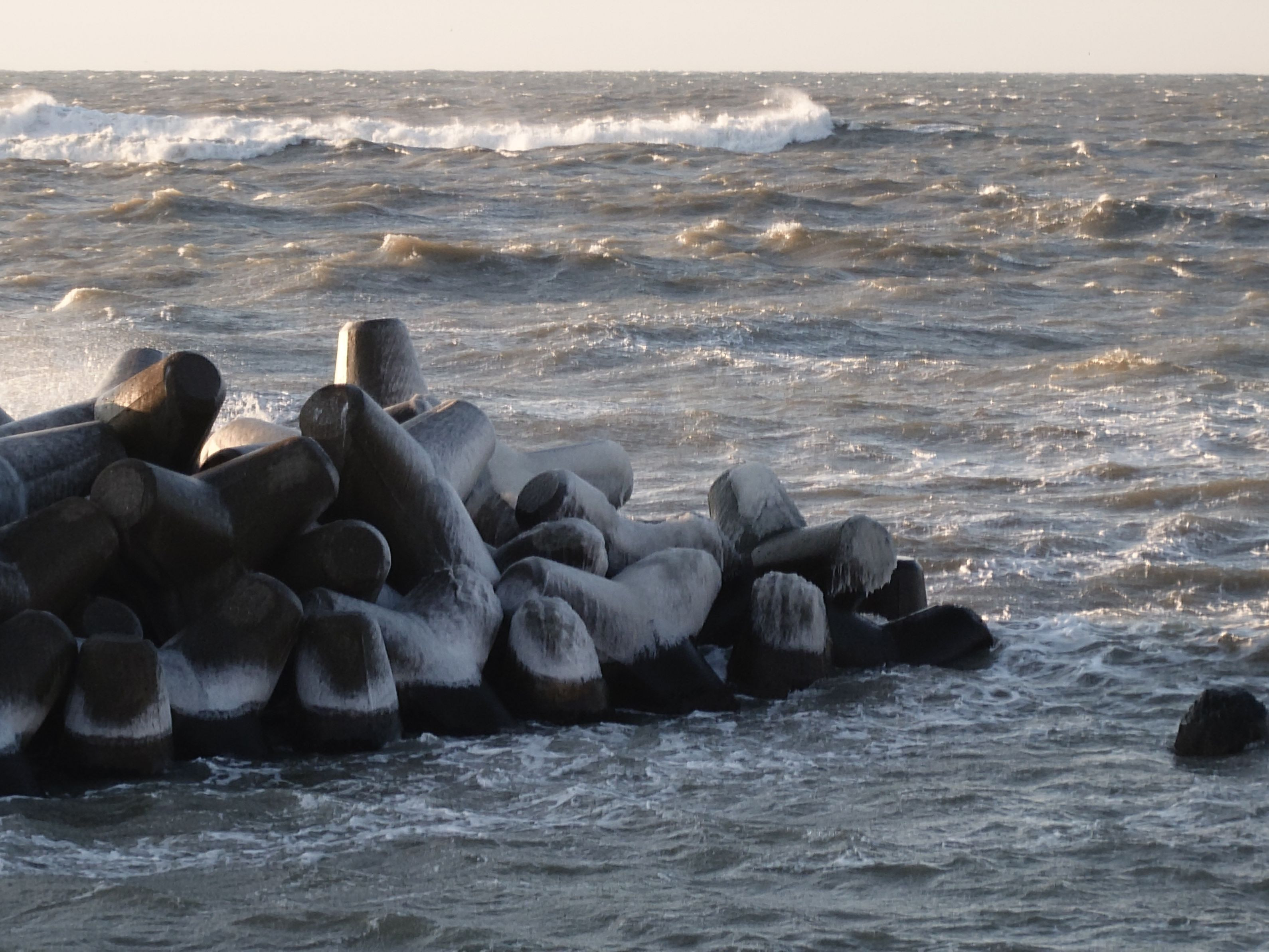 夕闇に浮かび上がる凍りついた波消しブロック