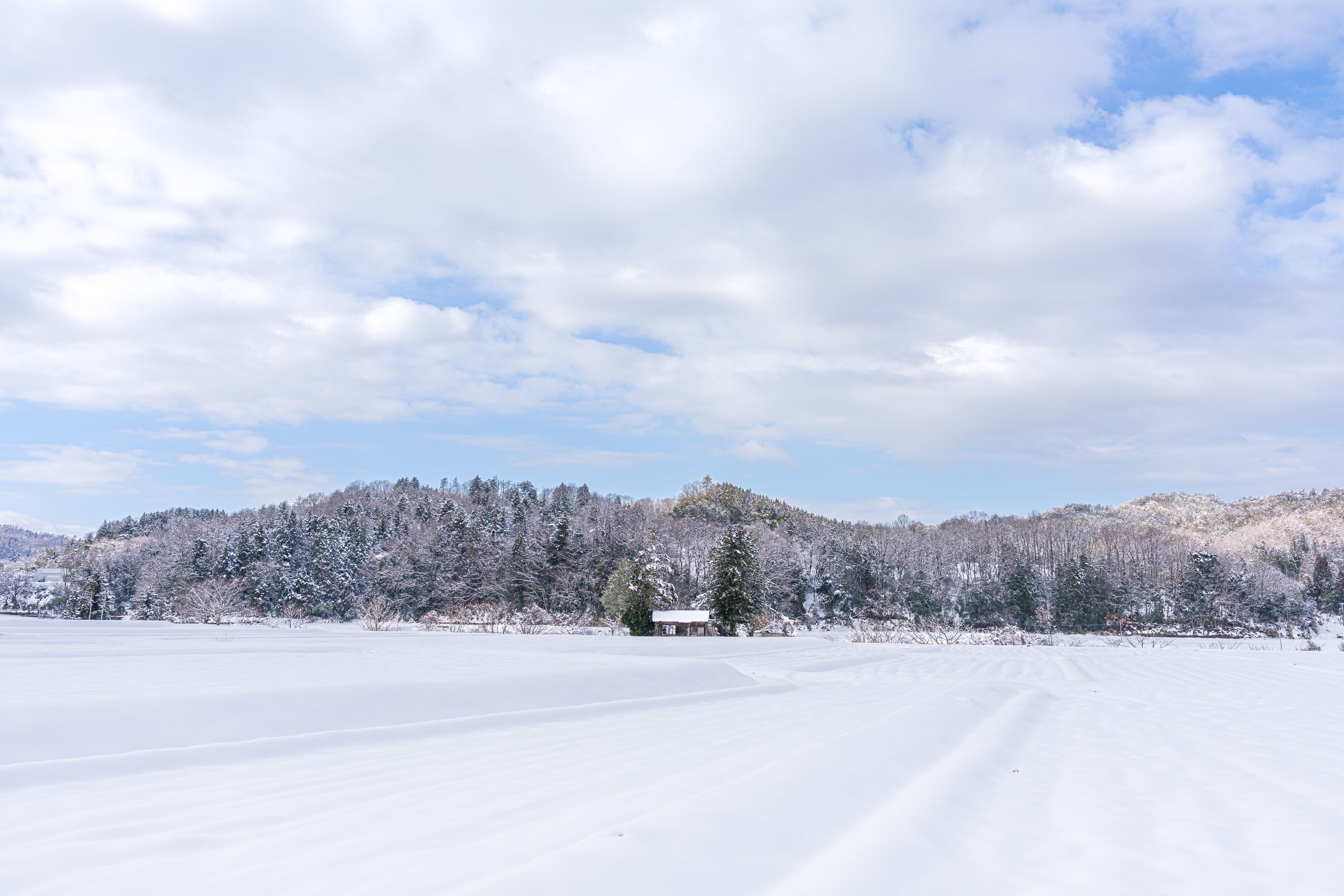 広い田んぼに積もったふかふかの雪。その奥にはポツンと小屋が。 田舎ならではの雪景色です。 location:島根県奥出雲町