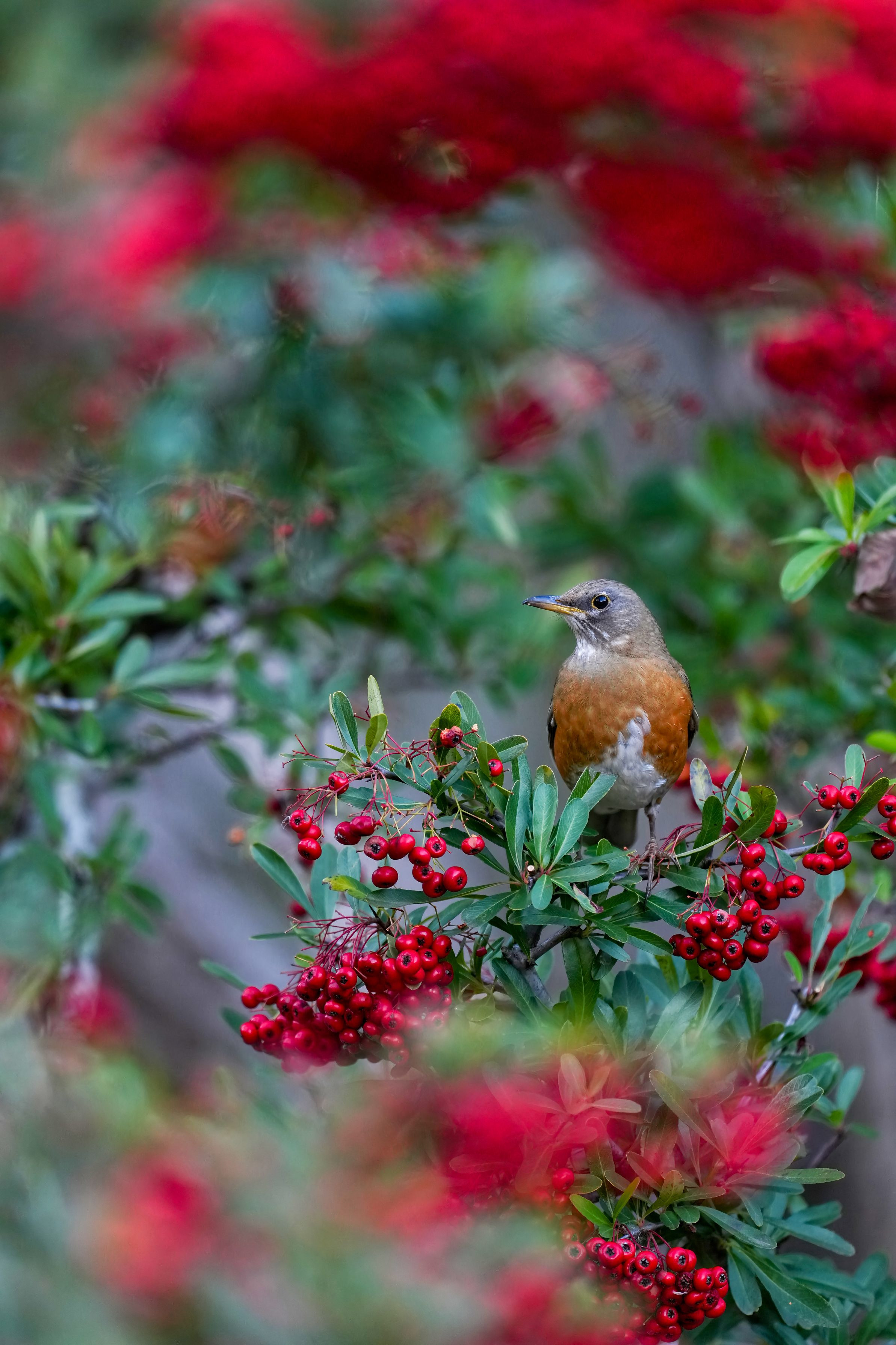 ピラカンサ食堂へアカハラさんもご来店です(^^♪ 早く食べないと無くなるよ(笑)