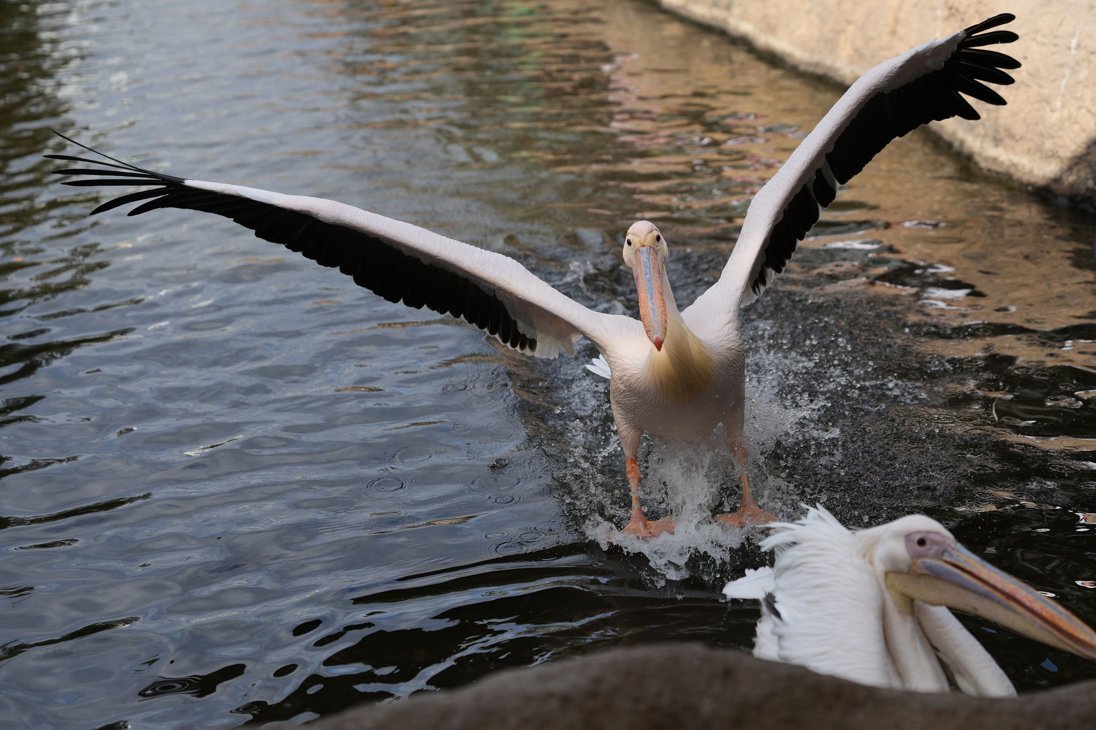 勢い余ってぶつかりそうになるペリカン