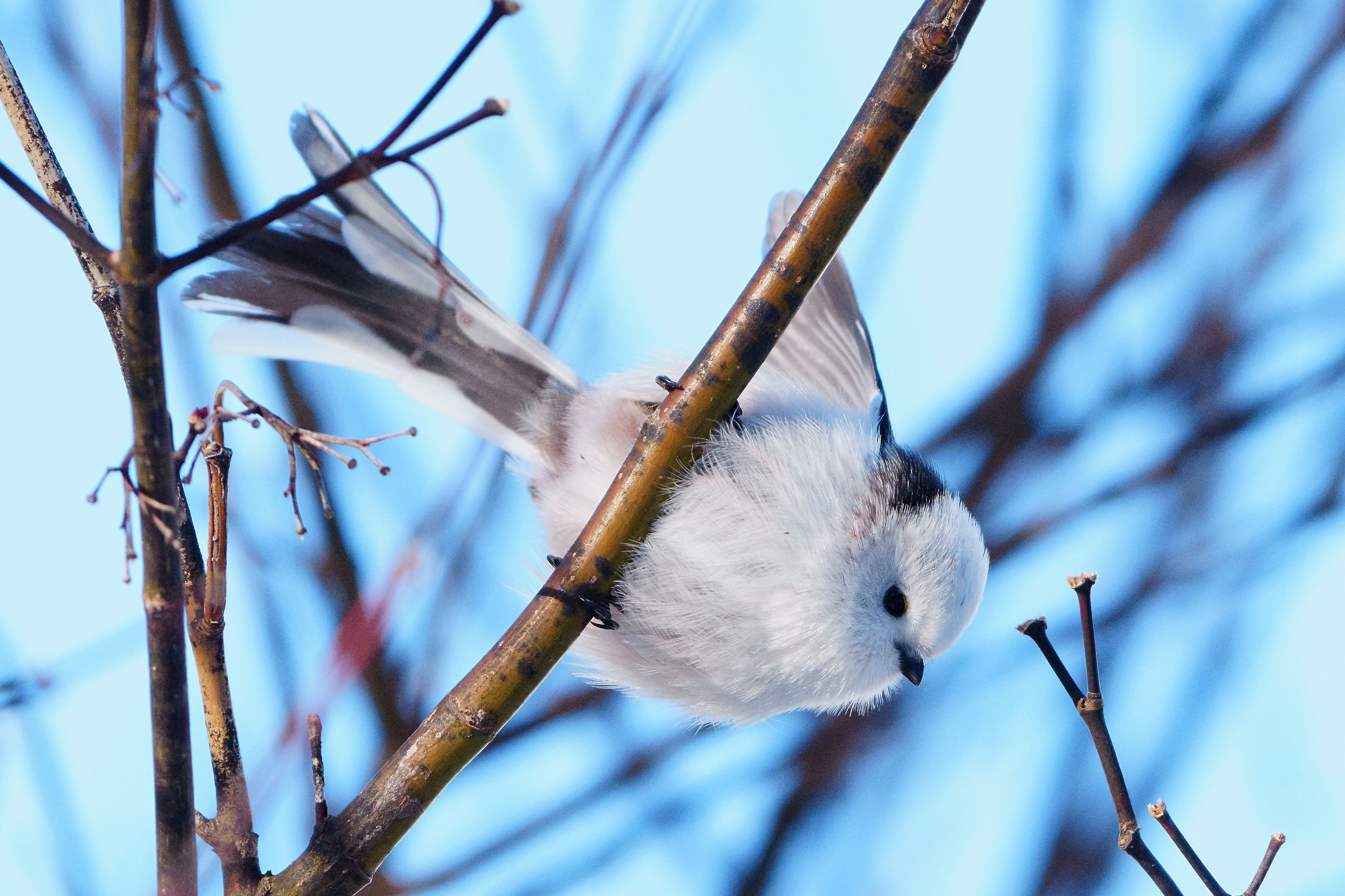 次の枝に飛び移るため羽を広げ始めたシマエナガちゃんです。 晴れて光が十分にあれば、SEL400800GもSEL300F28GM+SEL20TCと同程度に、シマエナガちゃんの羽毛が良く解像しますね。