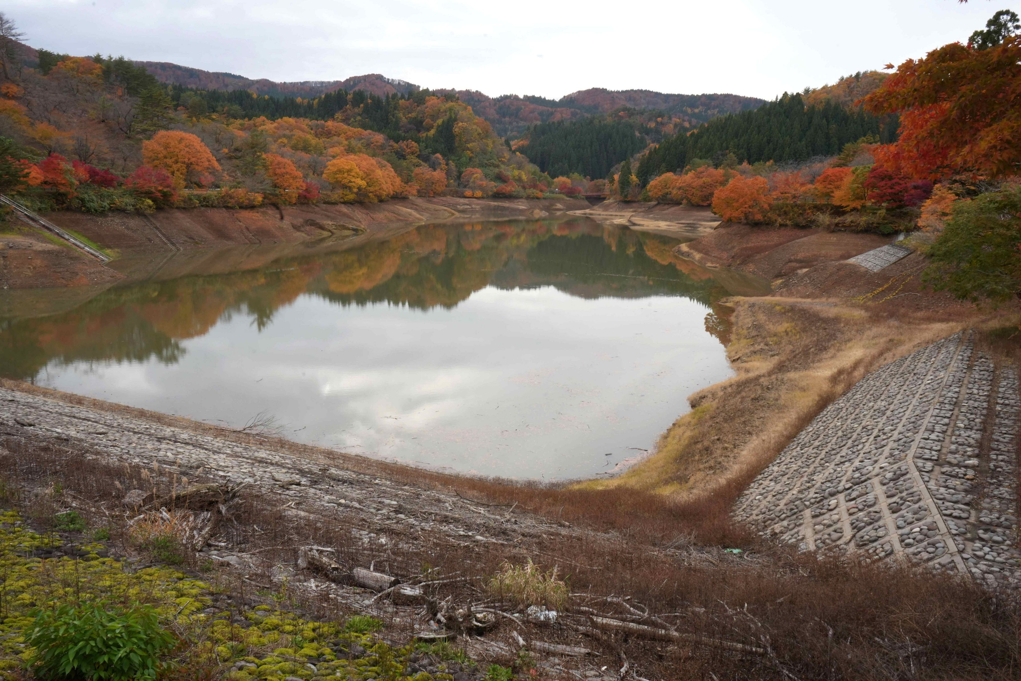 黄桜の里には小さなダム(多分、農業用)があり、この日は穏やか、、、 ダムの湖面も穏やかでダムサイトに彩る紅葉した木々が湖面に美しく映し出されていました。 最高でしたよ!!!