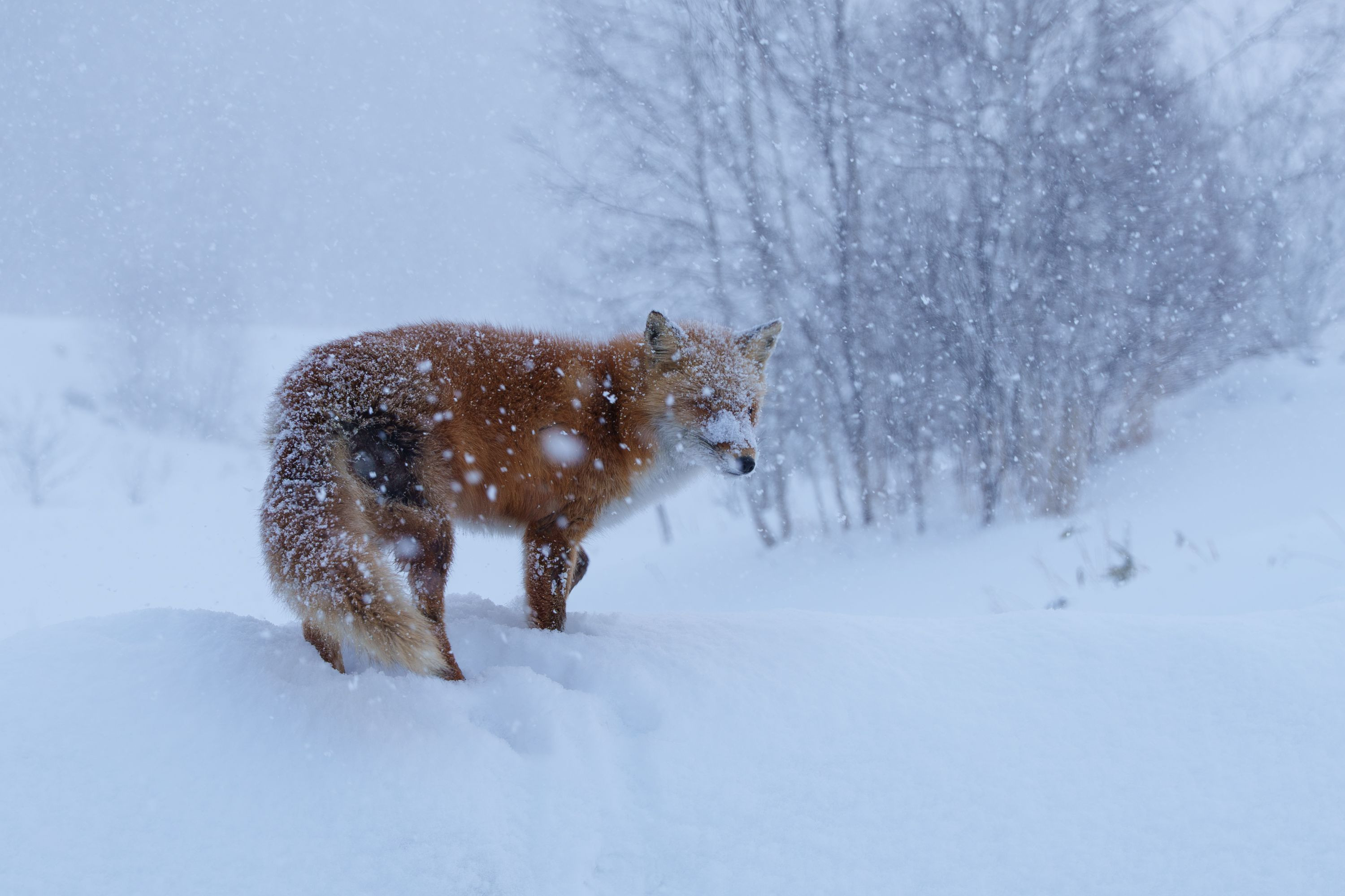 顔じゅう雪まみれのキタキツネさんですが、前はちゃんと見えているのでしょうか?晴れの日も吹雪の日も、生きるために餌を探さなければならないのは本当に大変そうです。