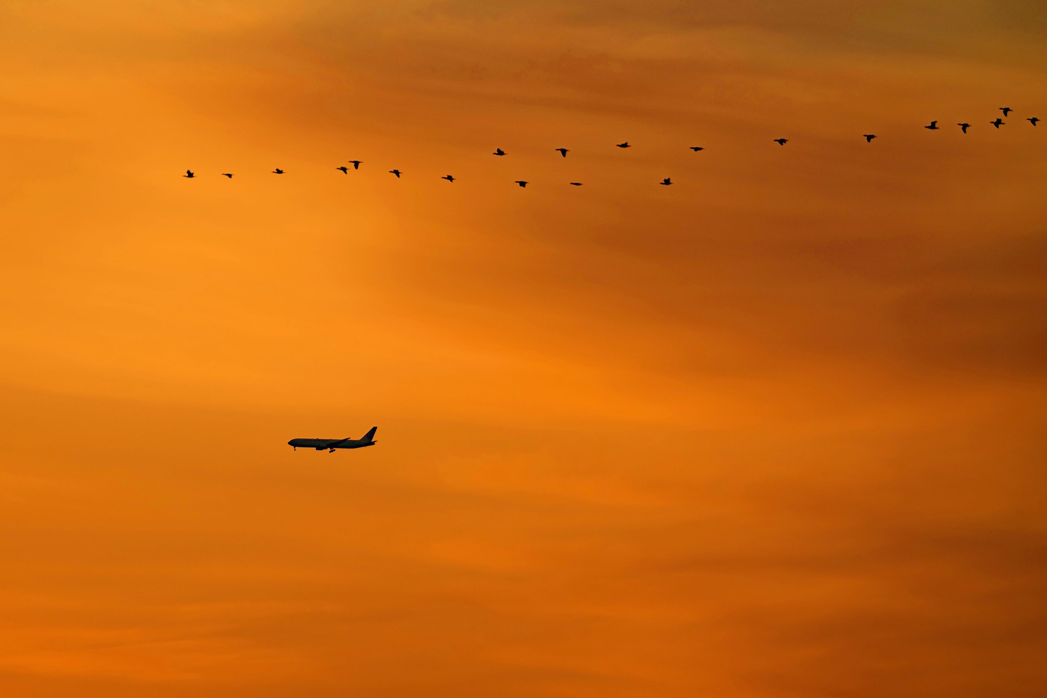 夕暮れの空、まるで渡り鳥に先導されるかのように旅客機が着陸態勢に入りました。