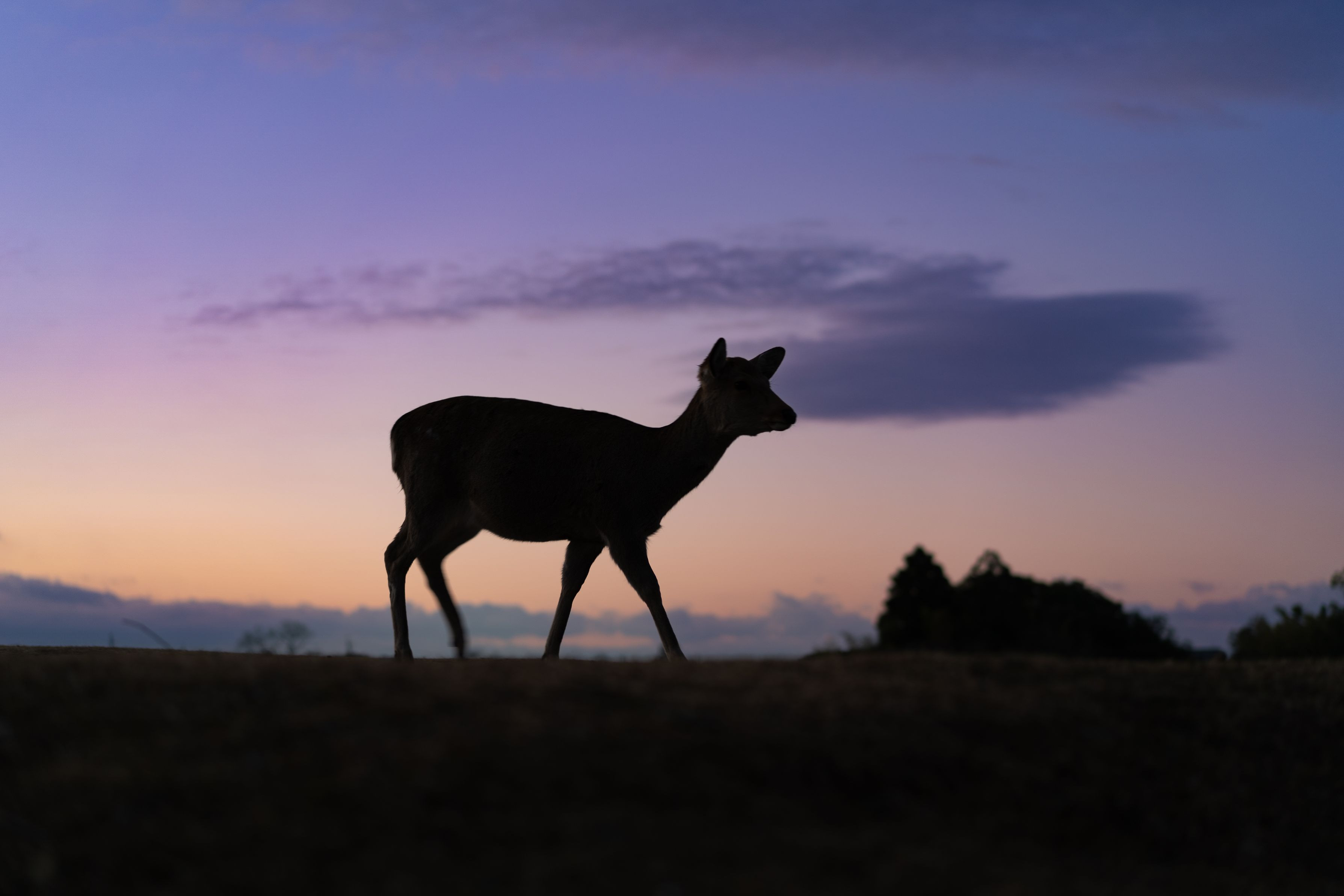 奈良公園 飛火野 早朝の丘に朝焼けの空 日の出を待つ鹿