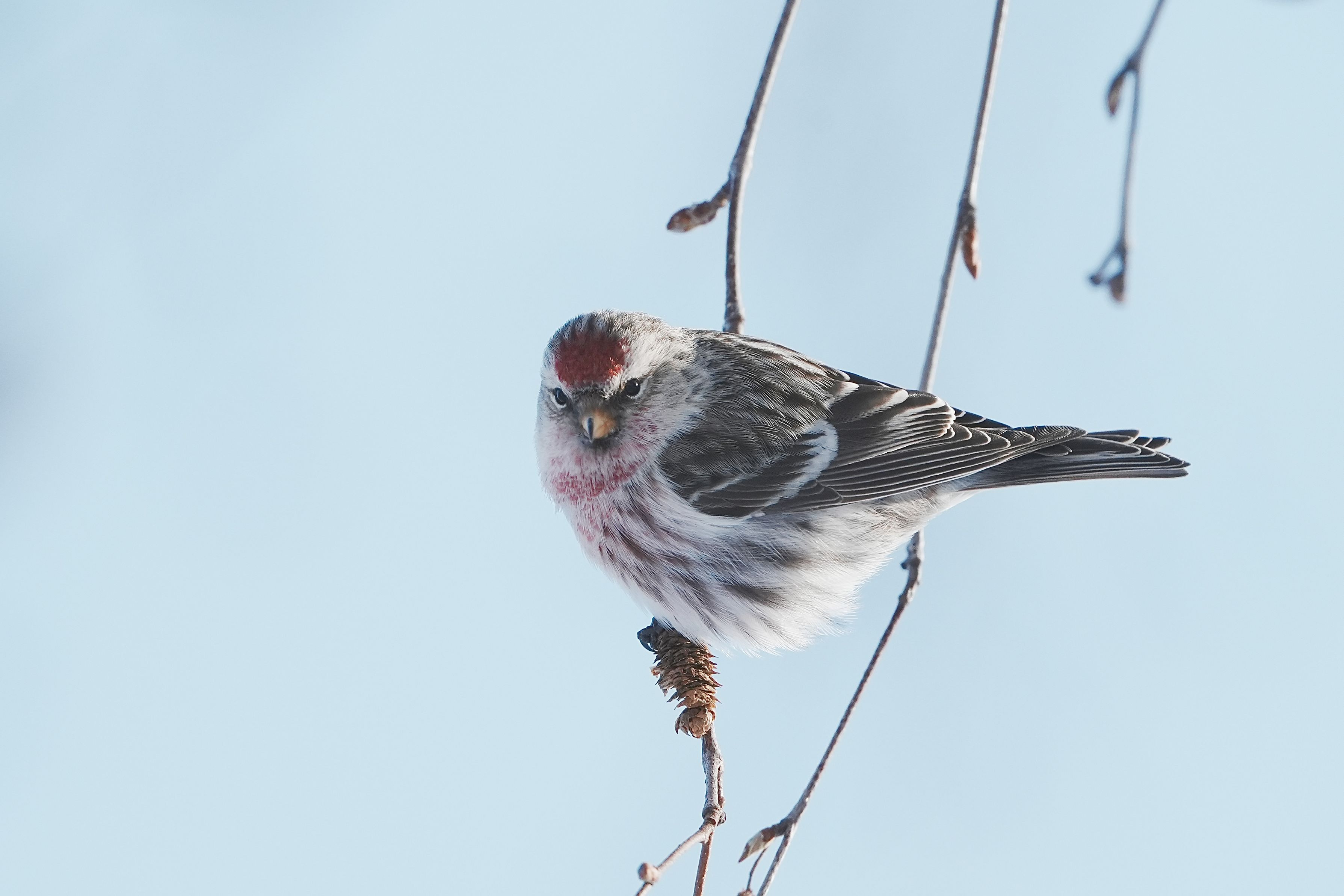 ベニヒワの群れが白樺の種を食べに来た。 近くの枝にオスのベニヒワが降りて来てラッキーでした。