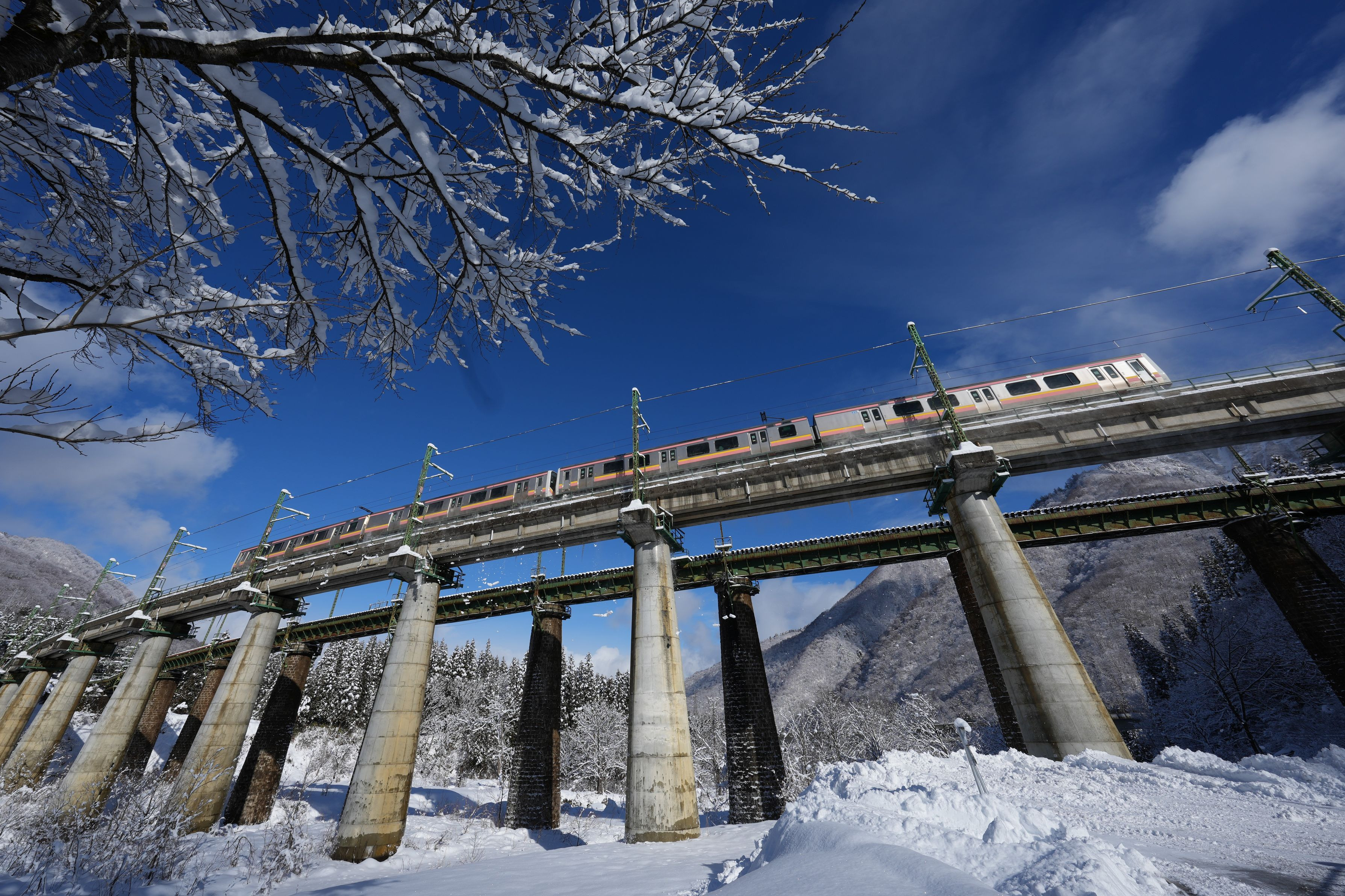 雪の日の少しの晴れ間に鉄橋を力走する上越線の電車
