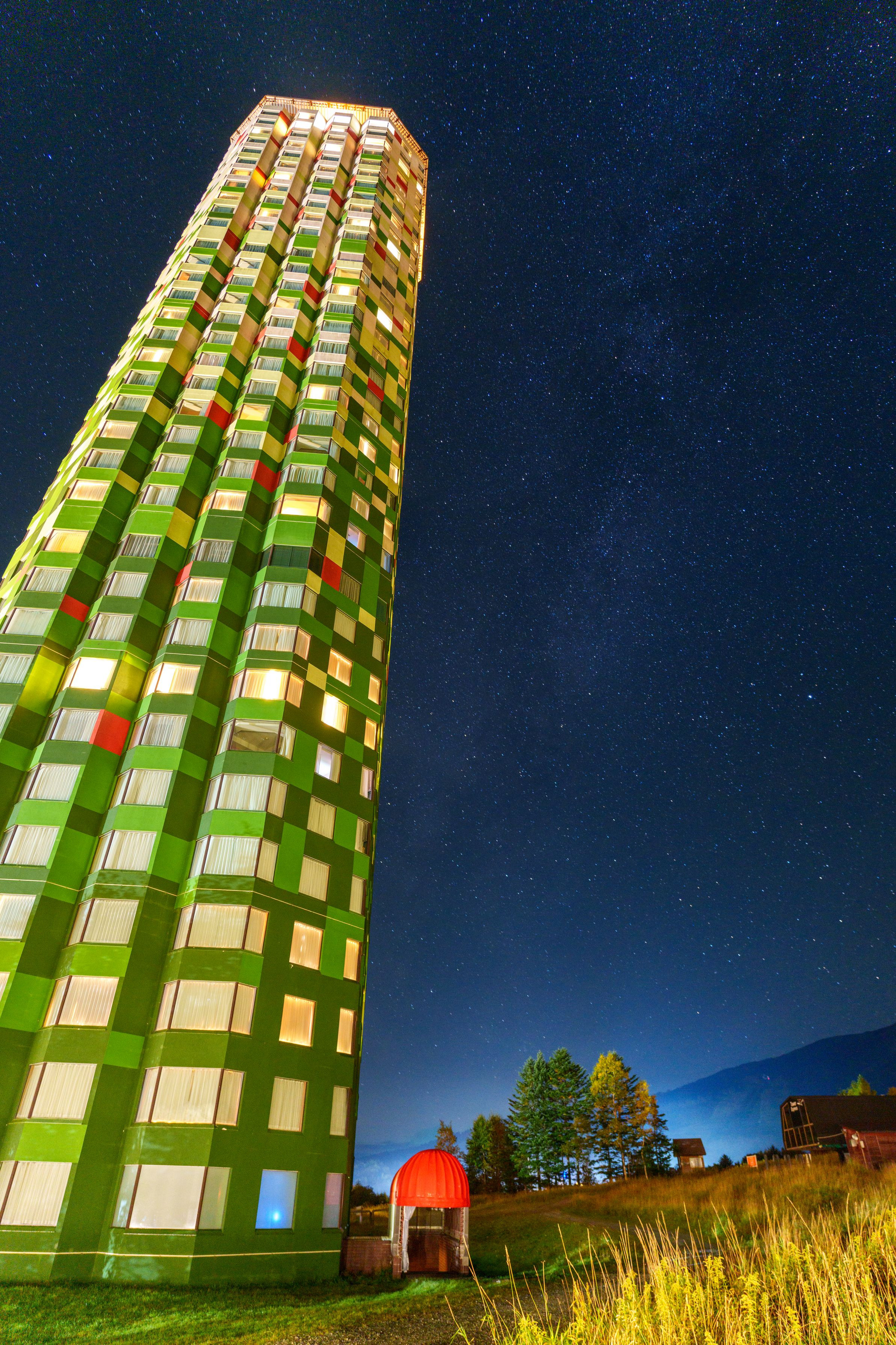 トマムザタワーを真下から見上げて。グリーンのモザイク外壁が夜空に向かって伸び、星々と競い合うように輝いていた。