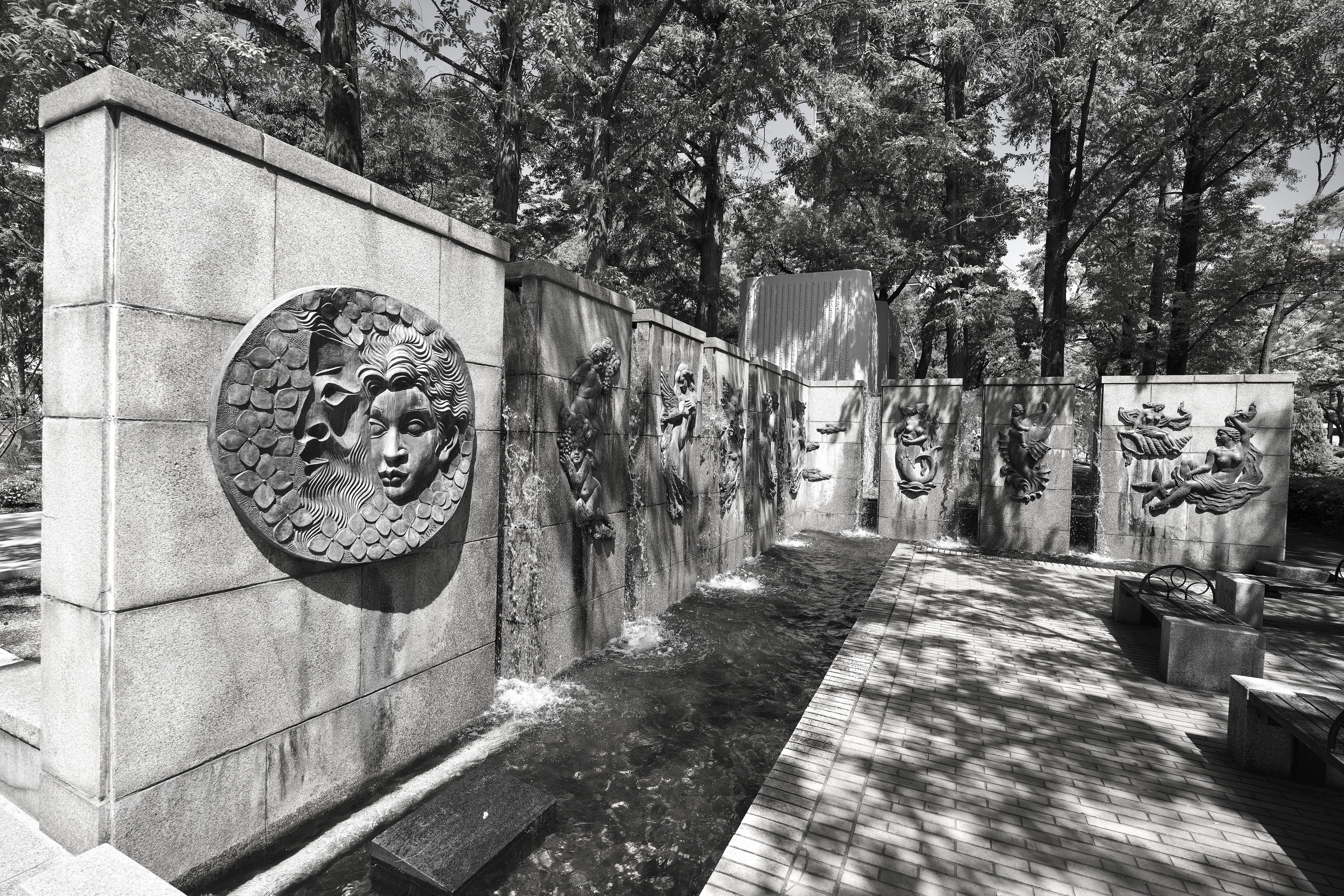 東遊園地にある錯視のレリーフです。 見る角度によって顔の表情が面白く変化します。