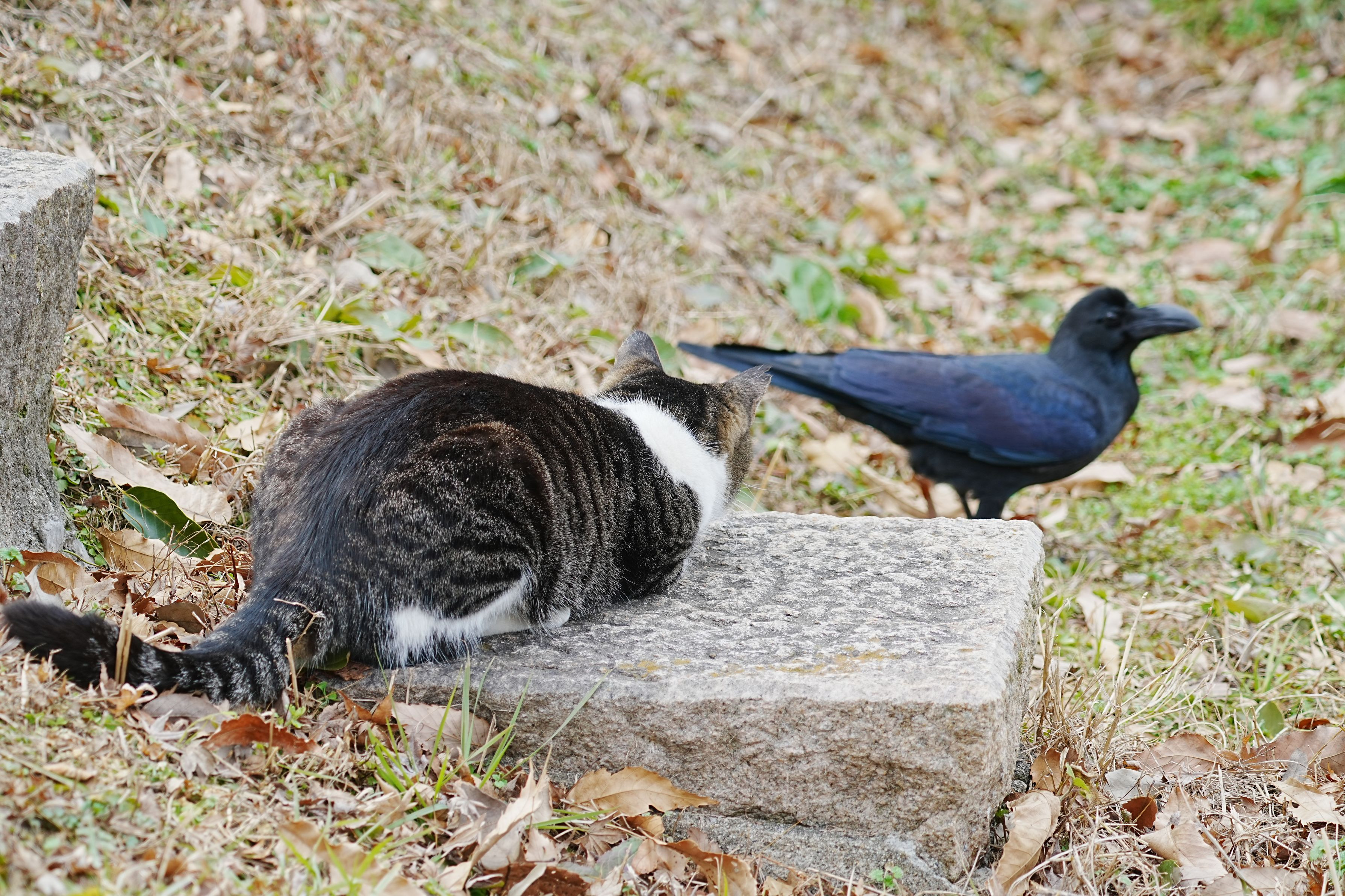 カラスを見つめる公園猫