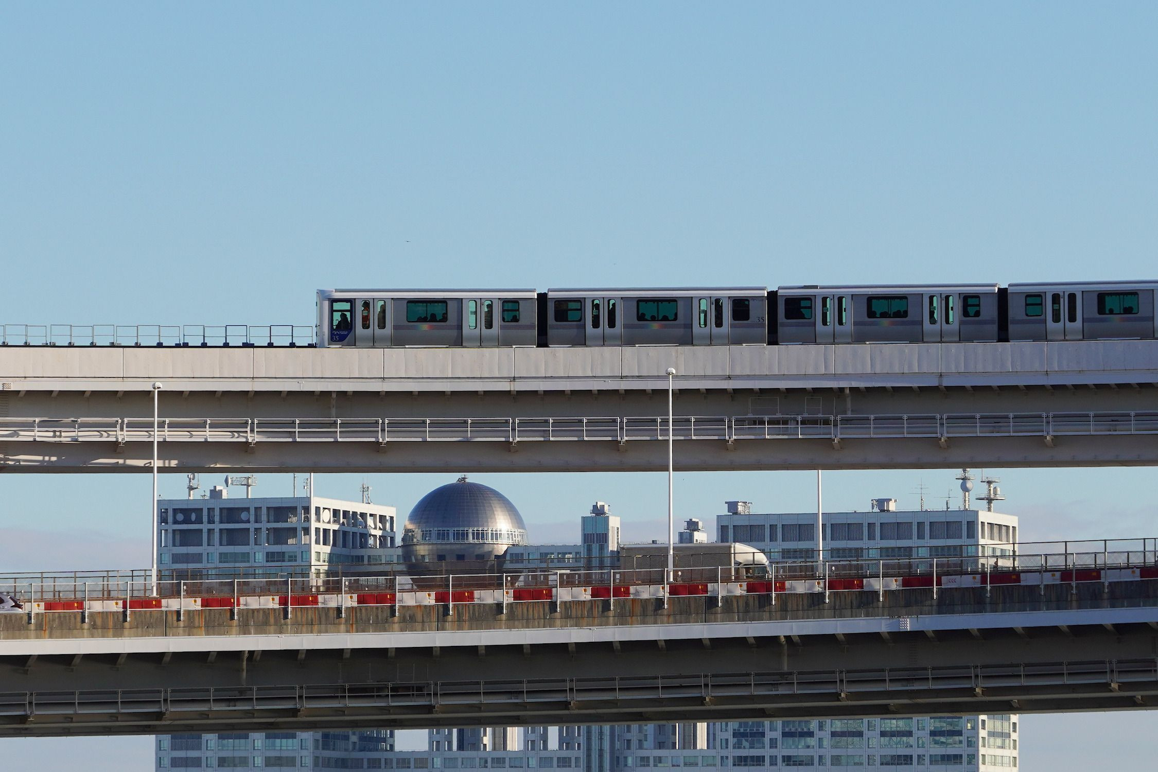 自動運転でゴムタイヤで走るけど「撮り鉄」で。 レインボーブリッジに続く芝浦側のループ。 上がゆりかもめ、下が一般道。 向こうの建物はフジテレビ。