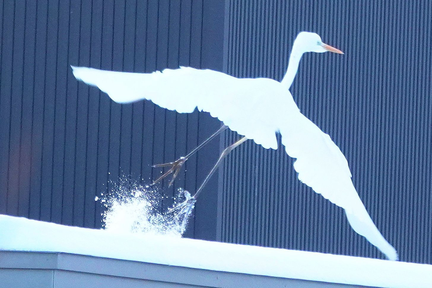 屋根にダイサギが止まっていて、見ていると飛び去った。