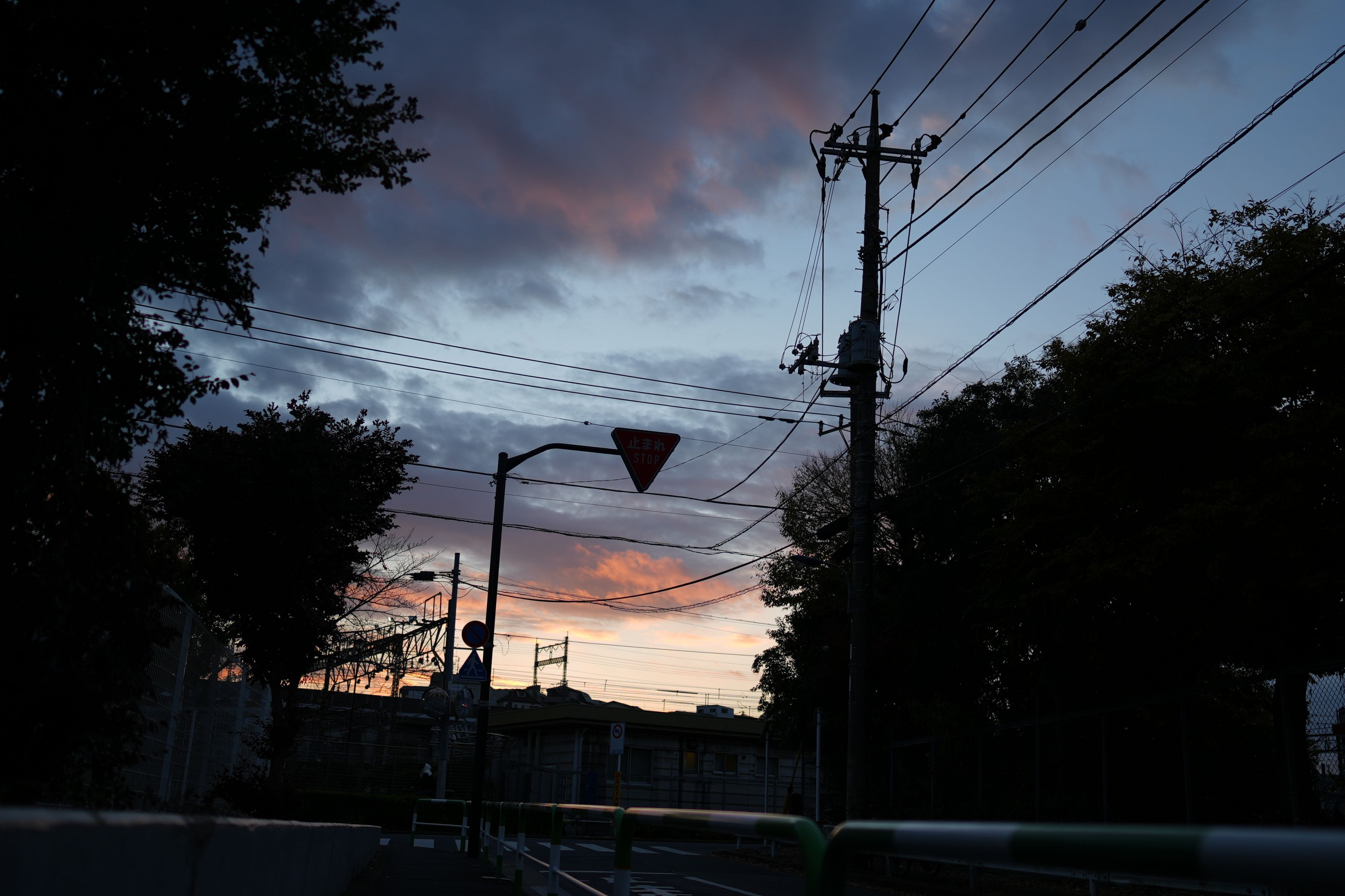 夕暮れ時の静かな街角を切り取った一枚です。沈みゆく空は青から橙へと移ろい、電線や電柱のシルエットが一日の終わりを静かに語ります。人の気配は少なく、ただ帰り道の風景だけが残り、どこか懐かしく、少し切ない時間が流れています