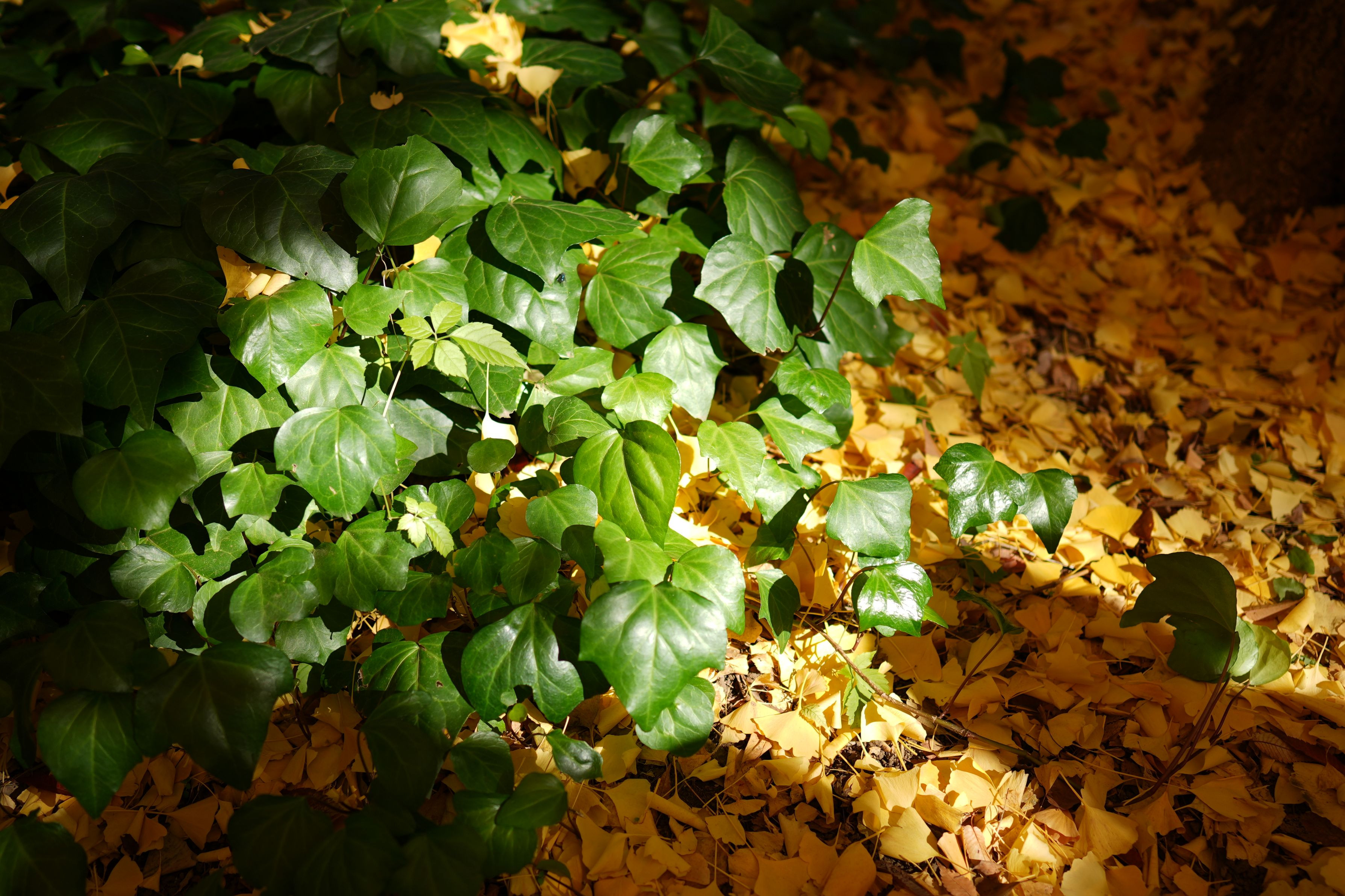 木漏れ日が差し込む地面に、緑の葉と黄金色の落ち葉が重なり合う秋の情景です。光に照らされた葉は静かに輝き、季節の移ろいと小さな生命の力強さをそっと伝えています。何気ない足元にある美しさを見つけた一瞬を切り取った作品です。