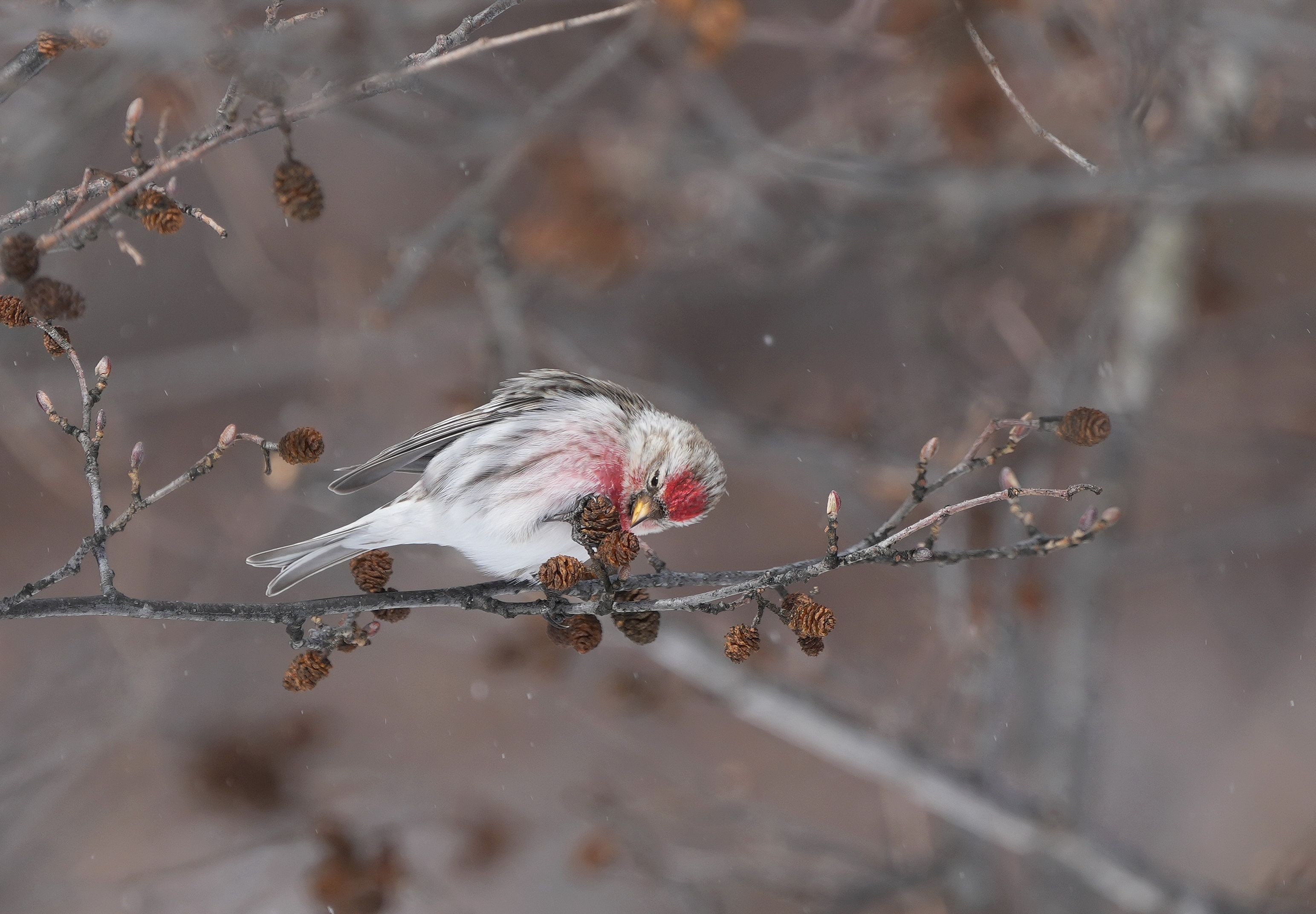 小雪混じりの突風が吹く中で、ハンの木の実を食べるベニヒワ。