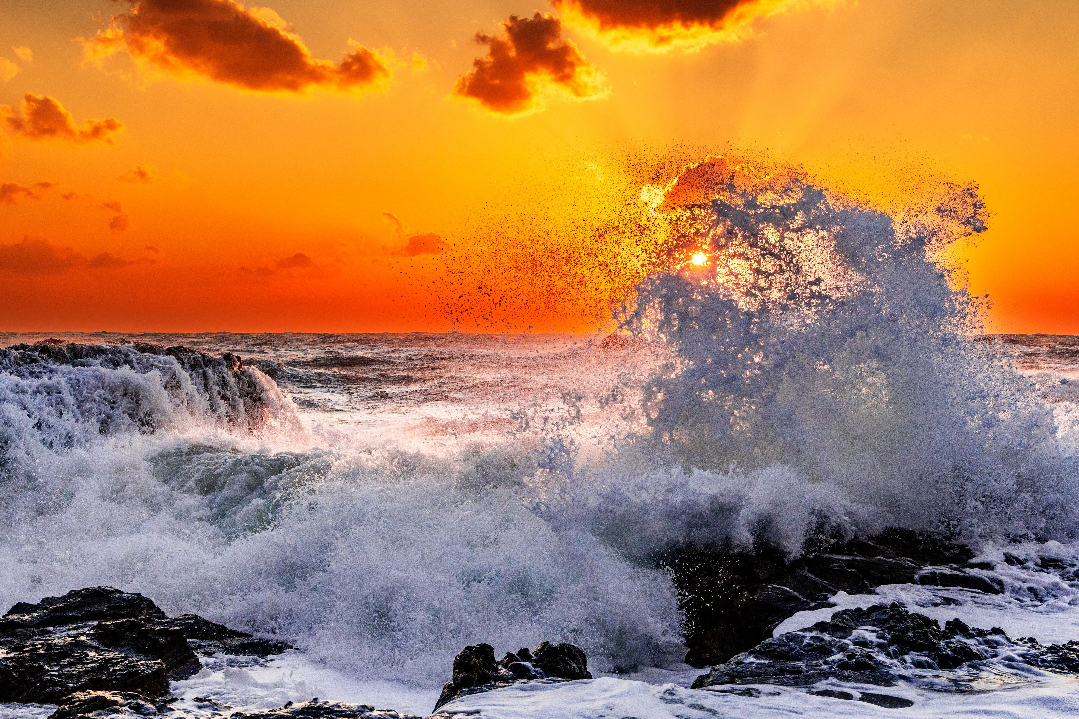 夕陽を背に、岩礁へ叩きつけられる波。 砕け散る飛沫の奥で、光が一瞬、形を持った。 止めたのは波か、時間か。 その刹那に、海の力だけが残った。