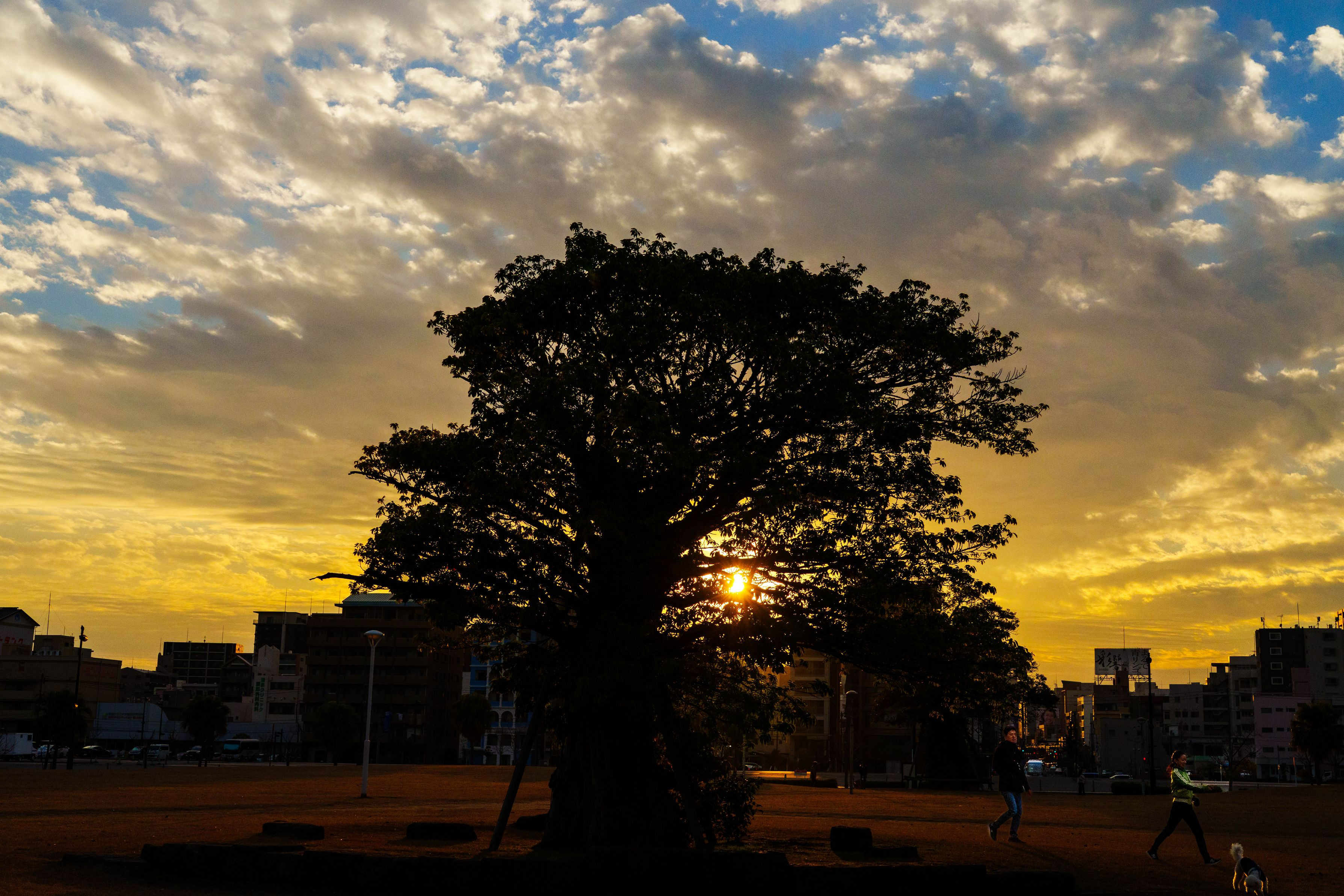 大きな木のシルエットが静かに佇み、その隙間から暖かな光の1点の灯火と日常を写し出しました。