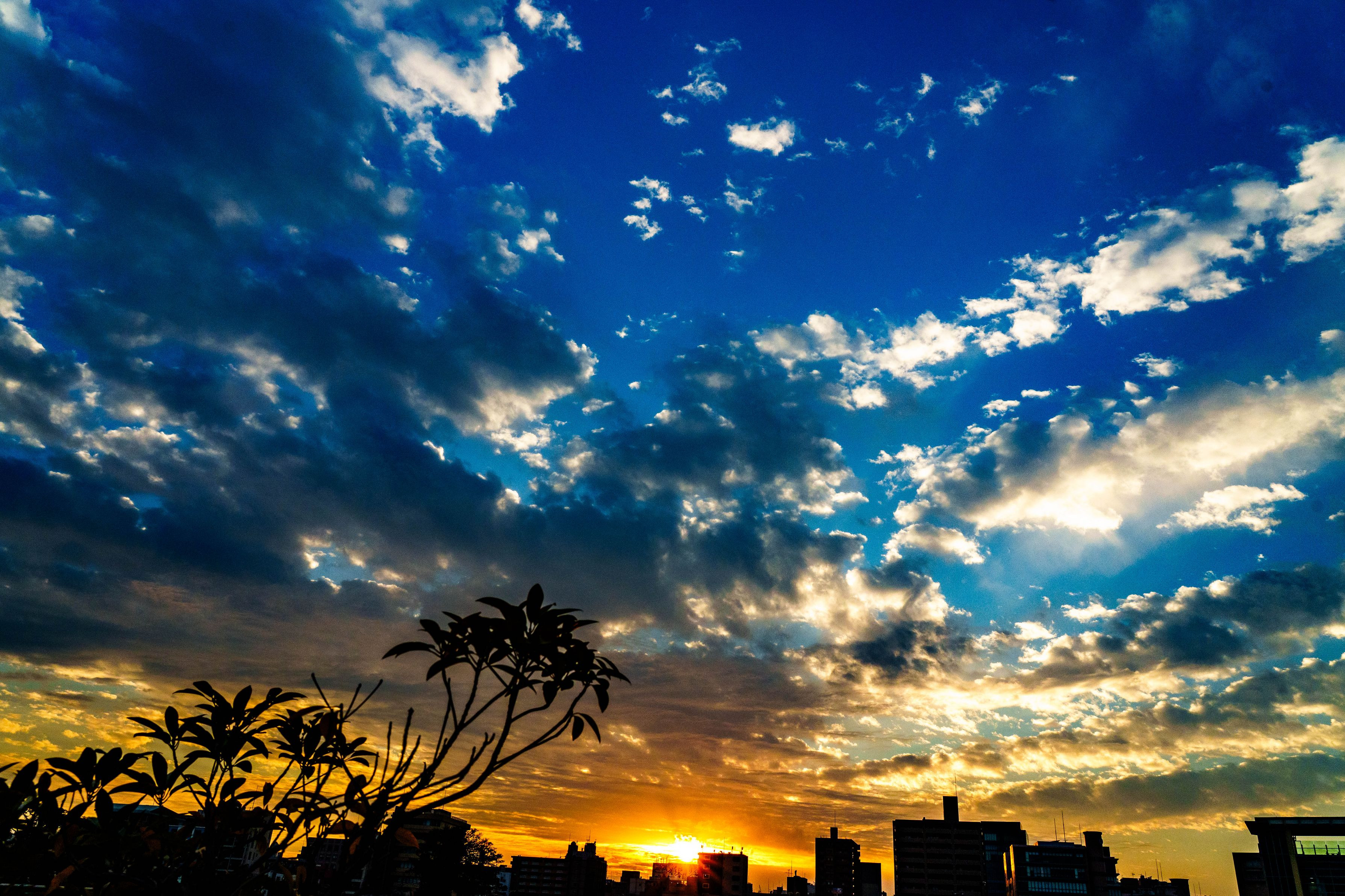 深みのある青い空と沈みゆく太陽の黄金色のコントラストが非常に綺麗で撮影しました。