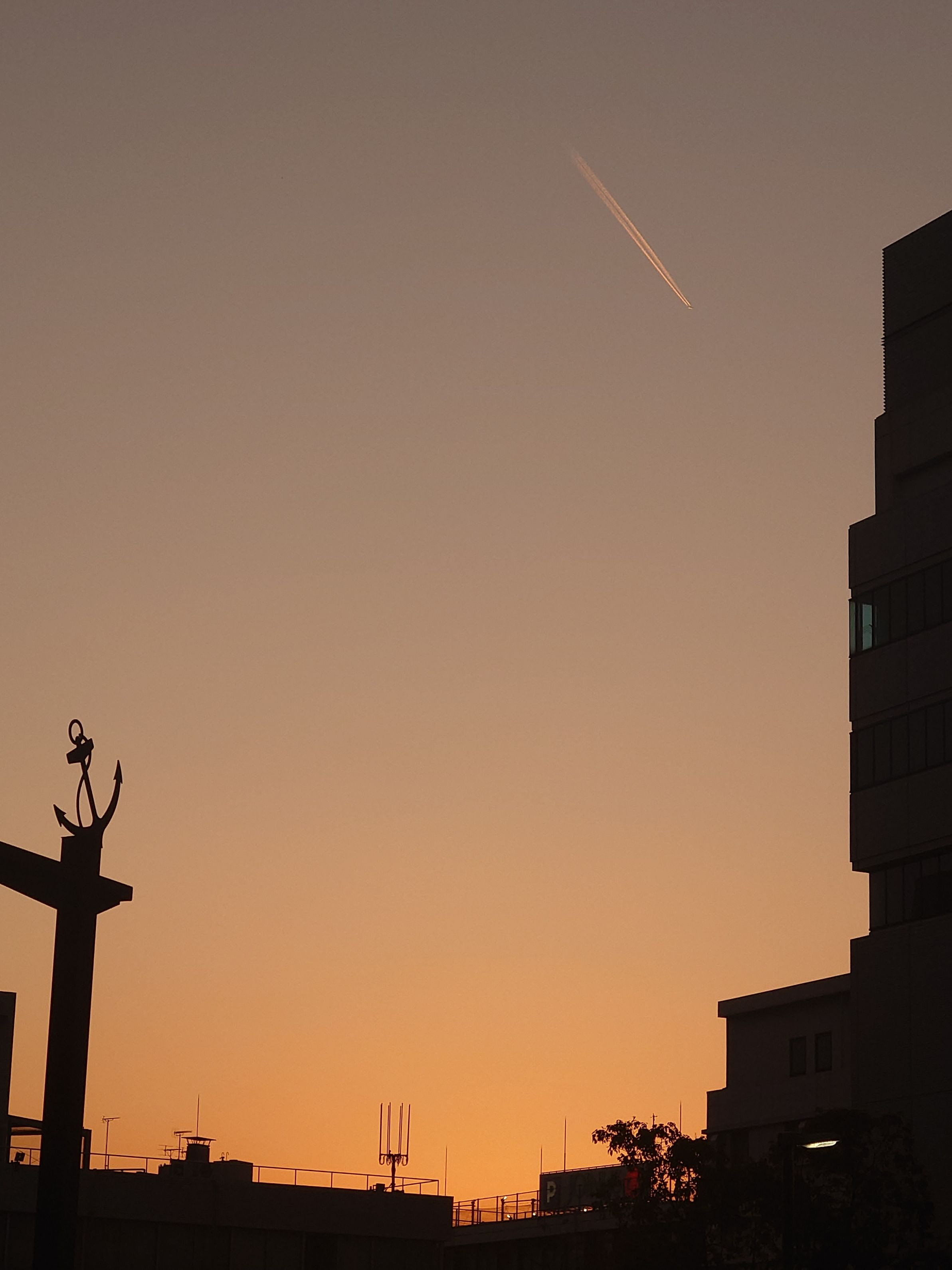 夕暮れ時のオレンジの空に飛行機の跡が見えた。