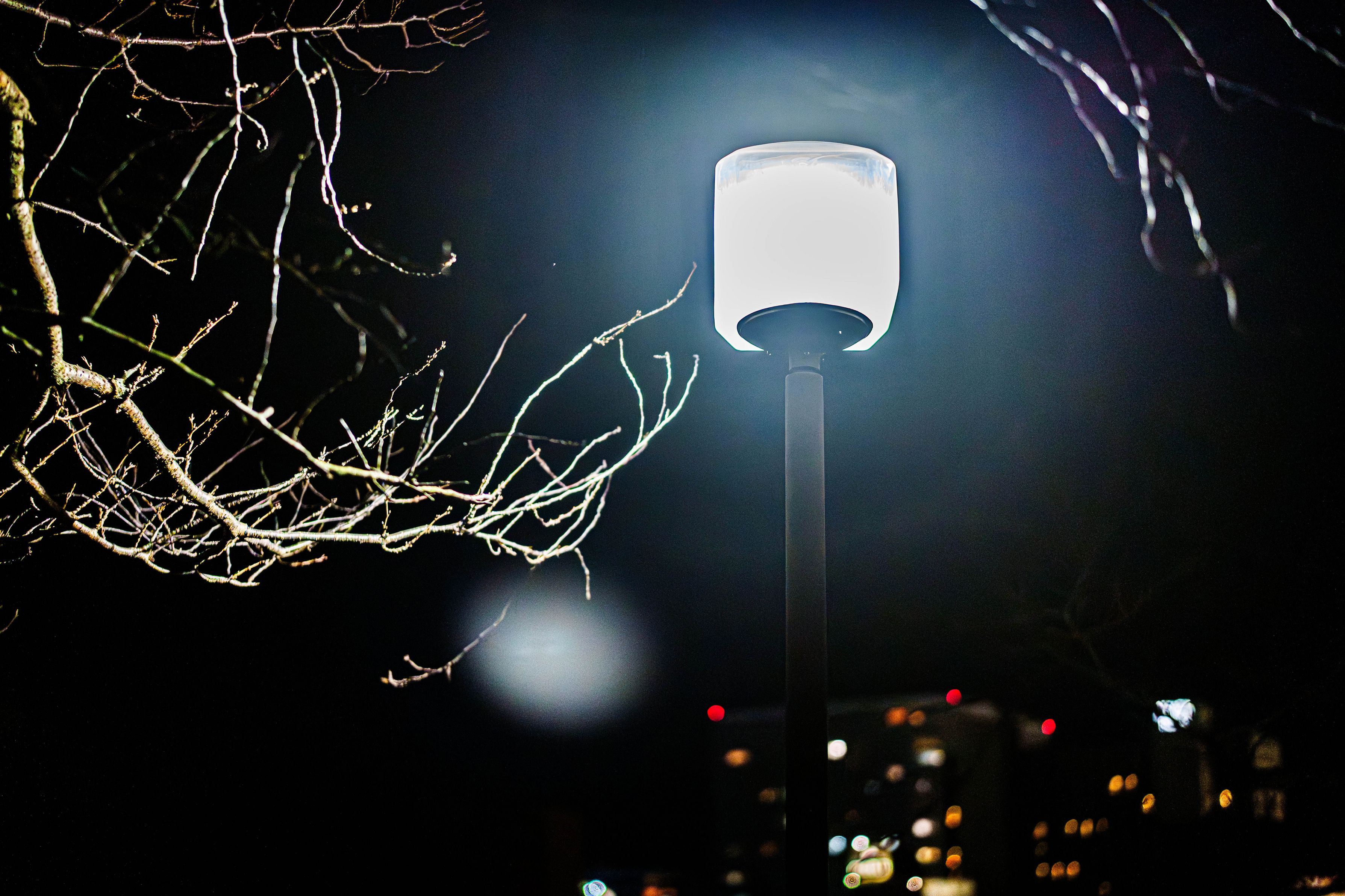 街灯の光が夜の静寂の中に溶け込んでいくような雰囲気を感じました。